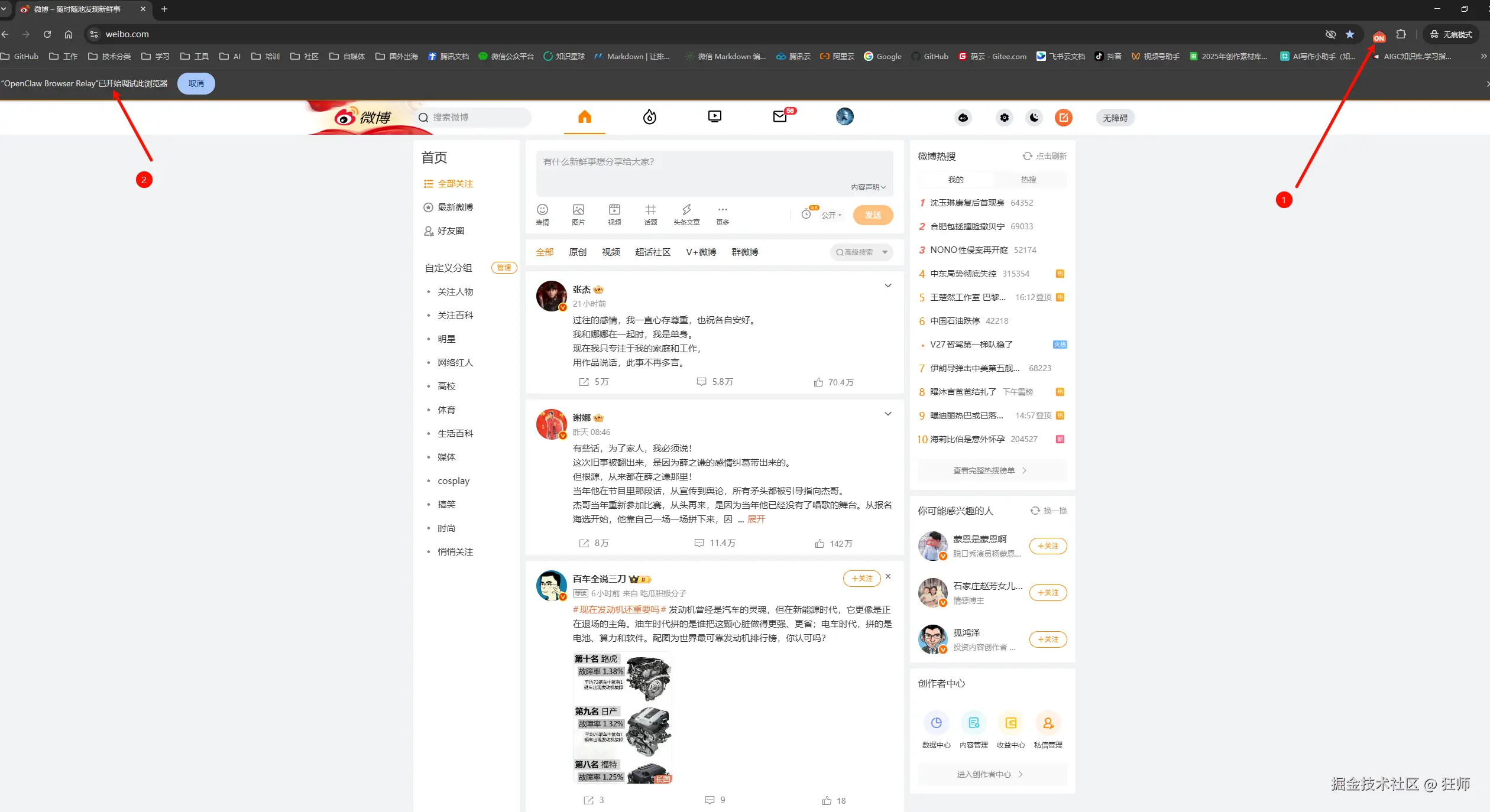 把 openclaw 插件固定到工具栏后,比如访问 weibo.com网站,点击插件,显示红色 "ON" 字样表示已 attached: