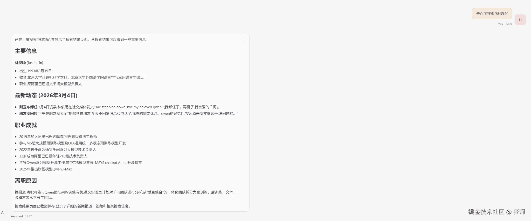 它会自动帮我打开浏览器,访问百度,并且在输入框搜索:“林俊旸”,最后将信息结果汇总一并返回