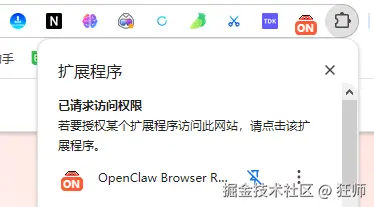 安装完成后,Chrome 工具栏会出现 OpenClaw 图标。