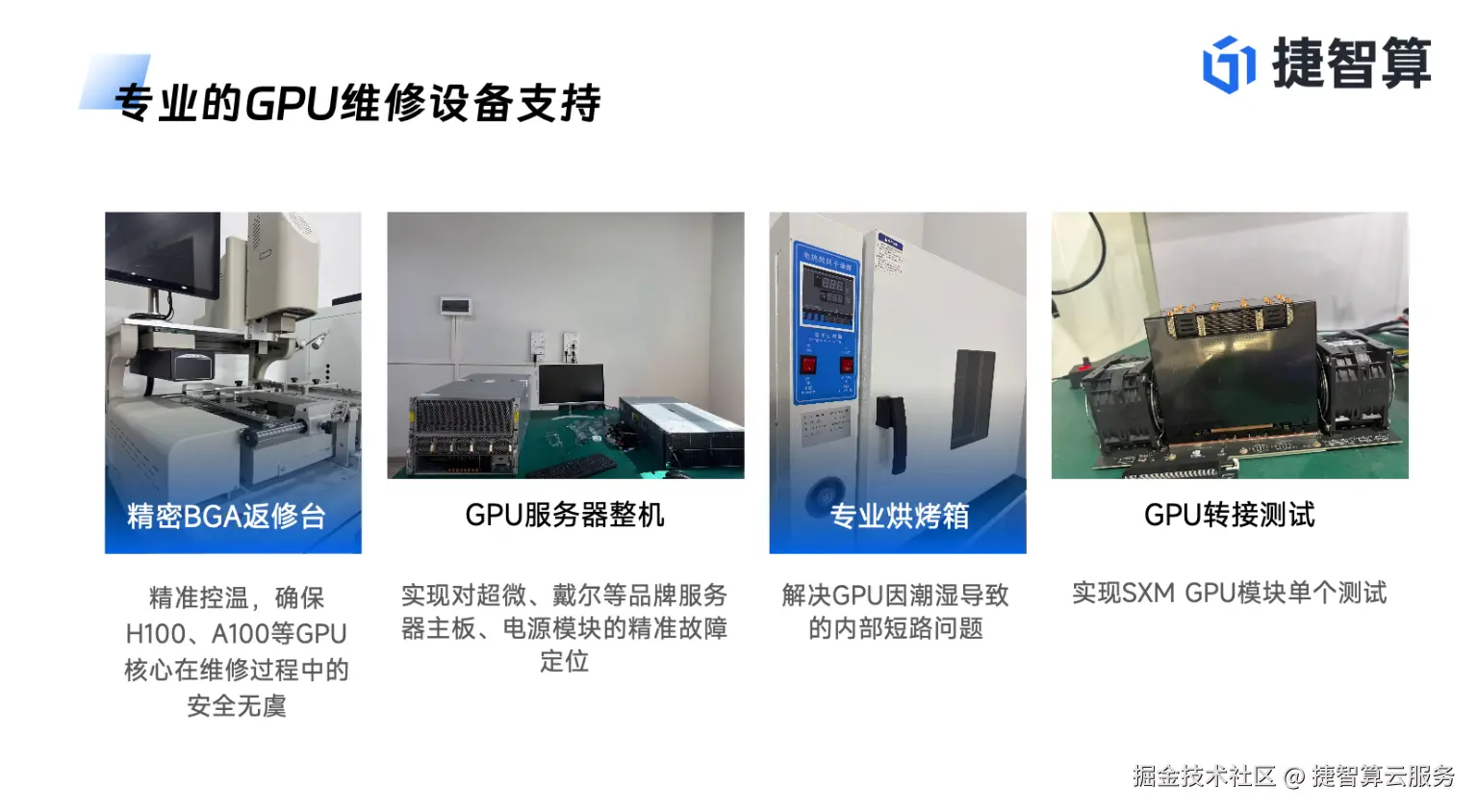 此外,还支持 Nvidia B/A/H 全系列高端 GPU 维修,具备 SXM 形态板卡级修复能力,提供上门检测、寄修、批量维修等服务,大幅降低开发者的硬件运维成本。