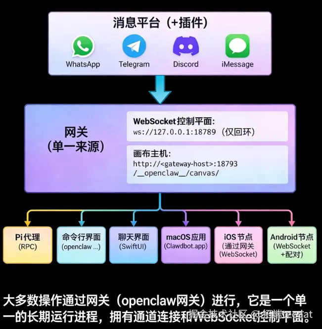 - 消息网关:作为统一入口,负责与不同消息平台(如WhatsApp、Telegram)建立连接、处理认证、接收用户消息并发送响应。