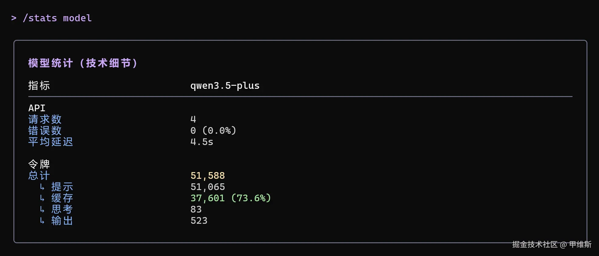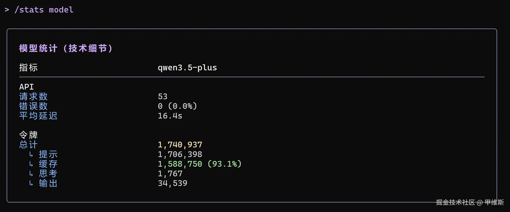 可以通过/stats model 查看消耗情况,显示简洁又详细。