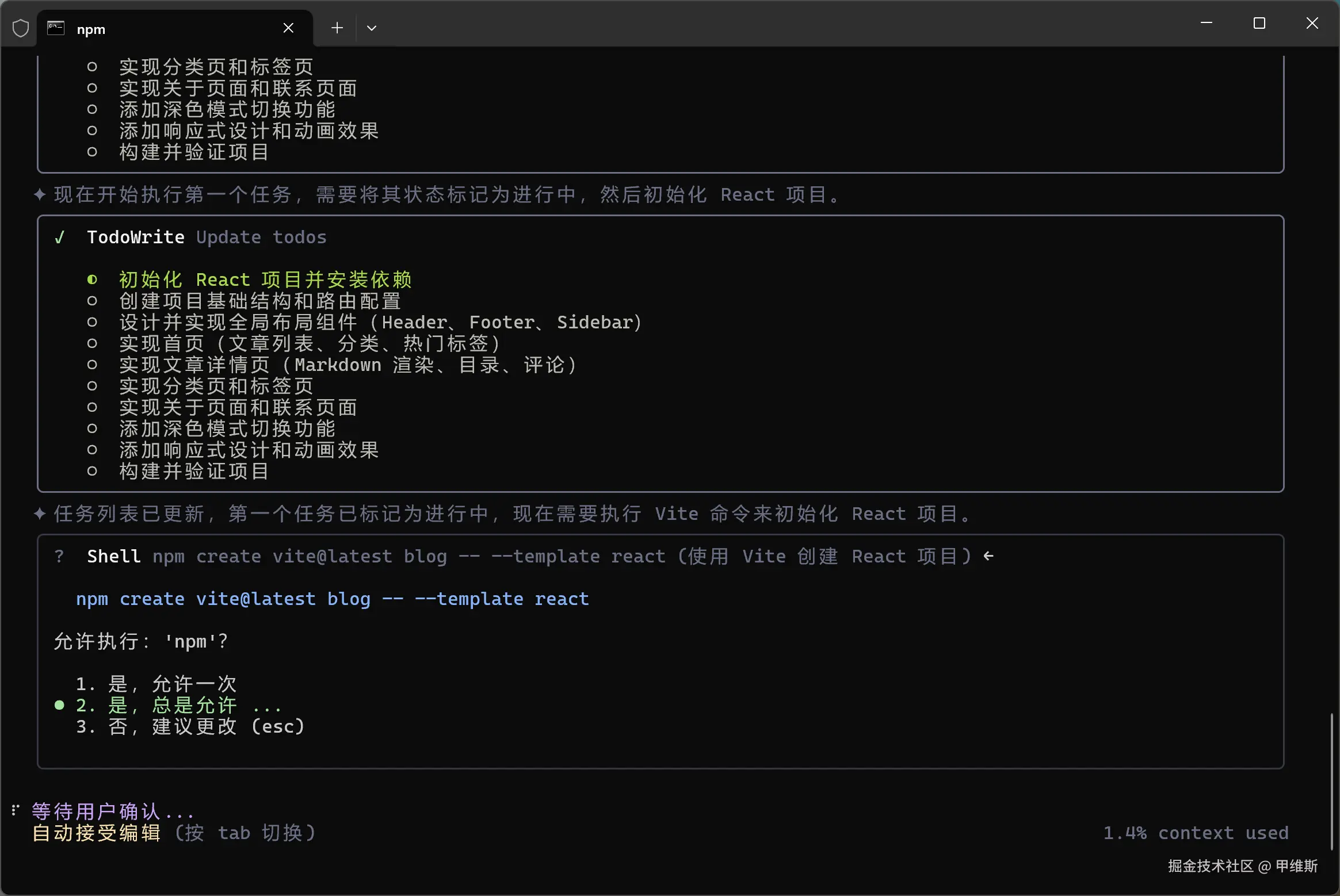 然后,用我最常用的提示词,做个简单测试:“用 React 开发个人博客,要求功能完善,设计美观,专业级 UI 和 UX。”