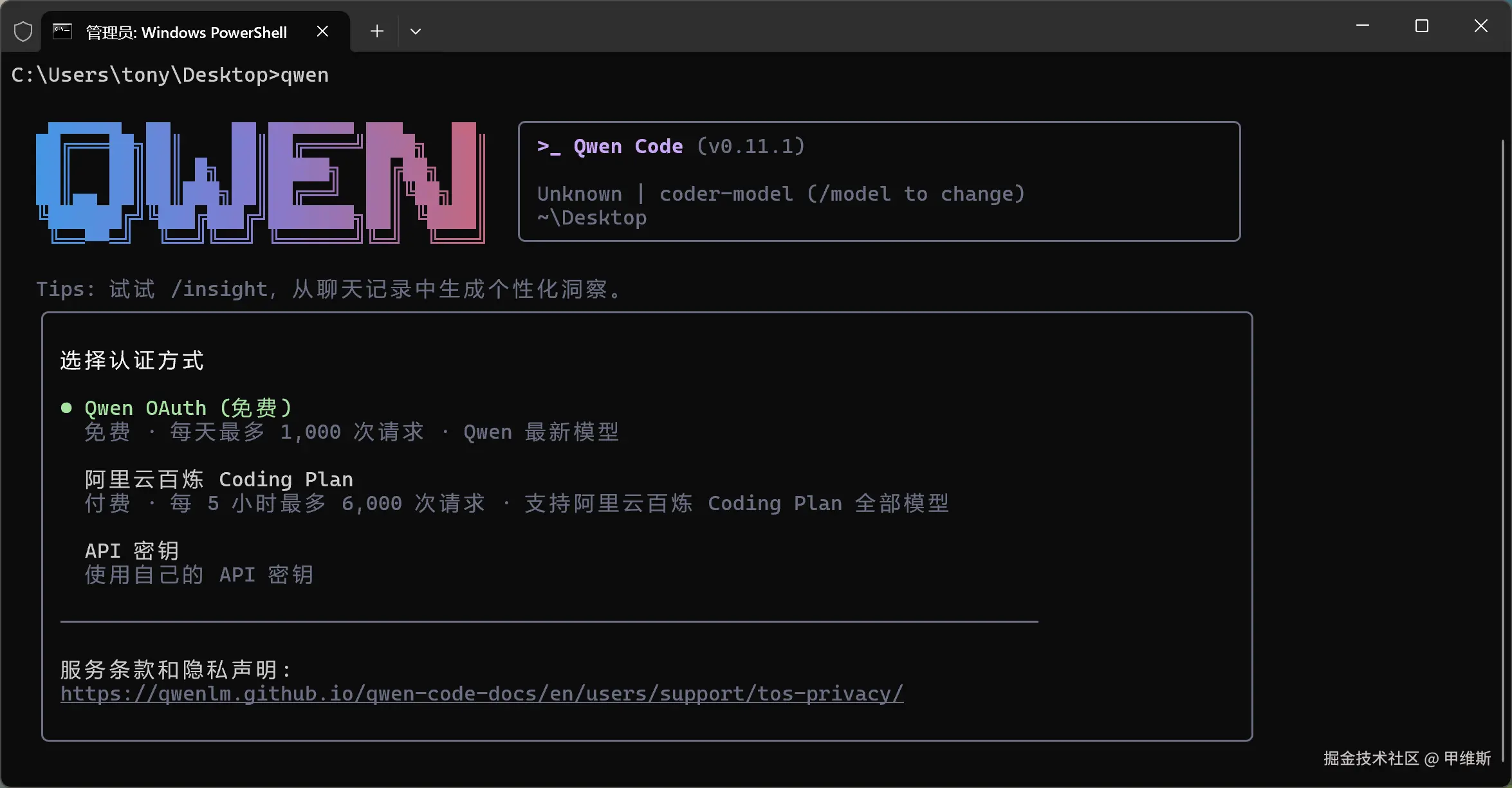 输入 qwen 命令启动,然后就会让你选择认证方式了。