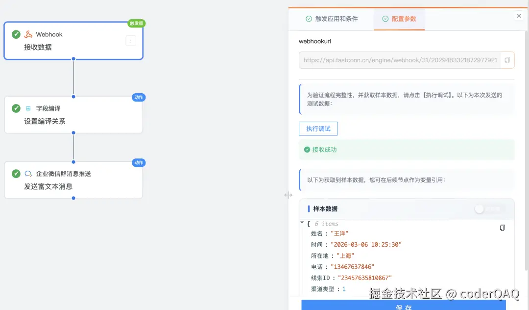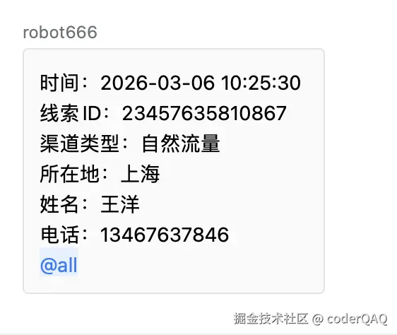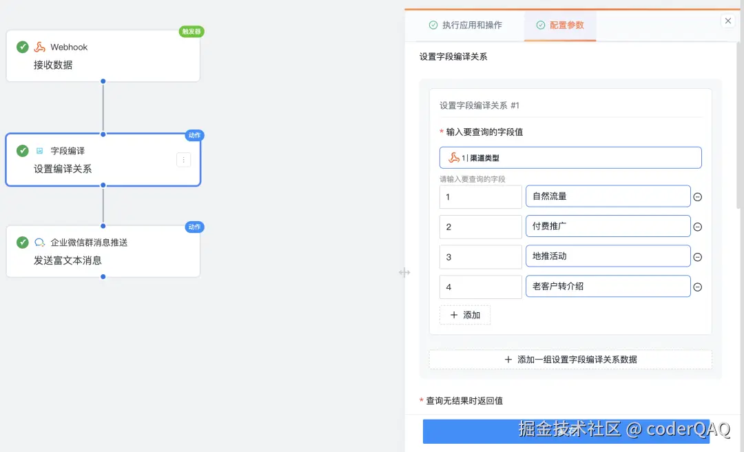 在企业线索收集、客户流量统计、在线咨询等场景中,经常会遇到这样的需求:外部系统通过 API 推送线索数据,其中流量来源、渠道类型等字段是数字编码,需要人工翻译后再发到企业微信群,不仅效率低,还容易出错。