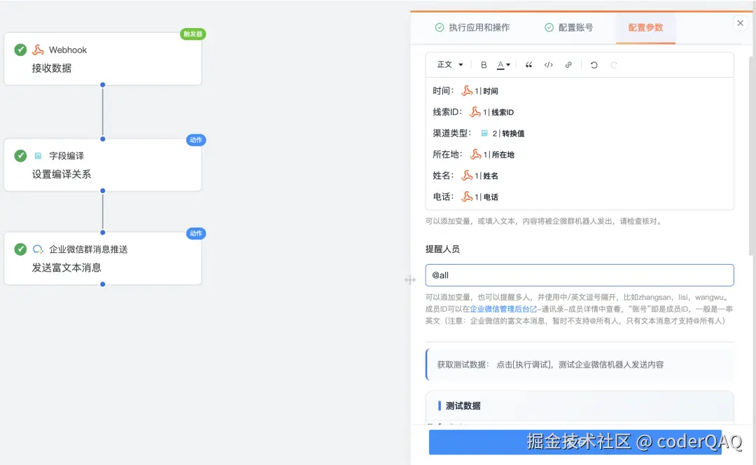 连趣云作为轻量化零代码集成平台,无需代码,只需通过「Webhook 接收 + 字段编译 + 企业微信机器人」三步拖拽,即可实现: