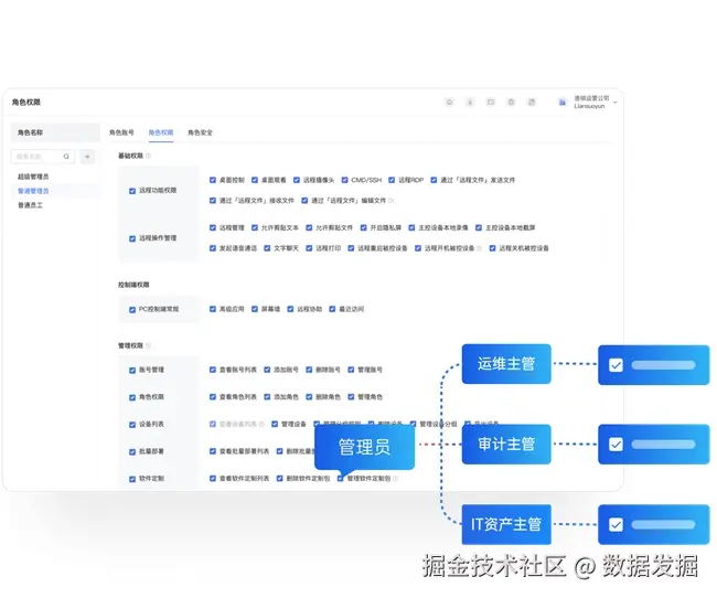 系统还支持基于角色设定不同的远控权限,如文件传输方向、剪贴板控制、远程打印、开关机等,进一步规范不同岗位的远程操作行为。