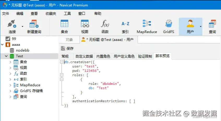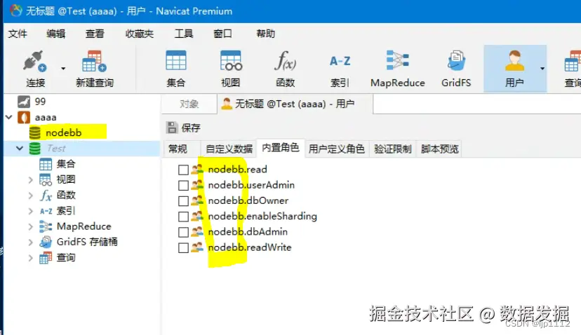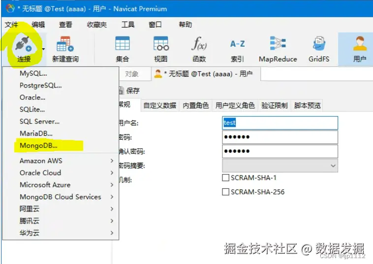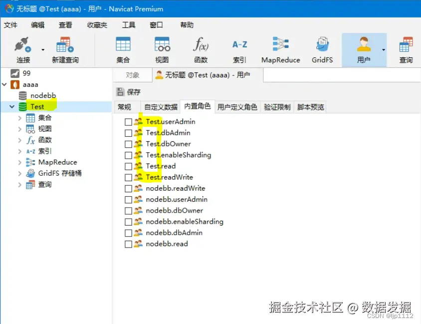 选择dbadmin角色 ,选择设置好用户名和密码,保存就可以了。