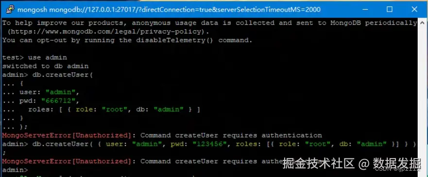 最近要试试搭建NodeBB论坛,试试水。结果就是卡在mongo数据库,怎样都没办法用命令建一个用户。看了好多教程都不成功。命令创建用户老是提示错误。