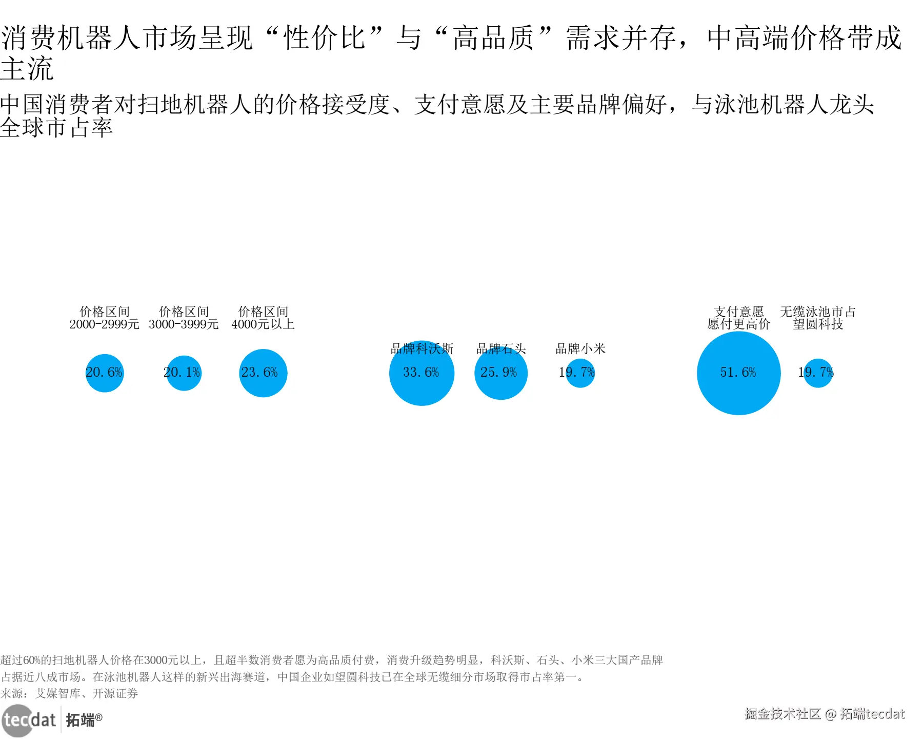 消费机器人市场呈现“性价比”与“高品质”需求并存。艾媒智库调查显示,超过60%的扫地机器人价格在3000元以上,科沃斯、石头、小米三大国产品牌占据近八成市场。51.6%的消费者愿为高品质支付更高价格,消费升级趋势明显。