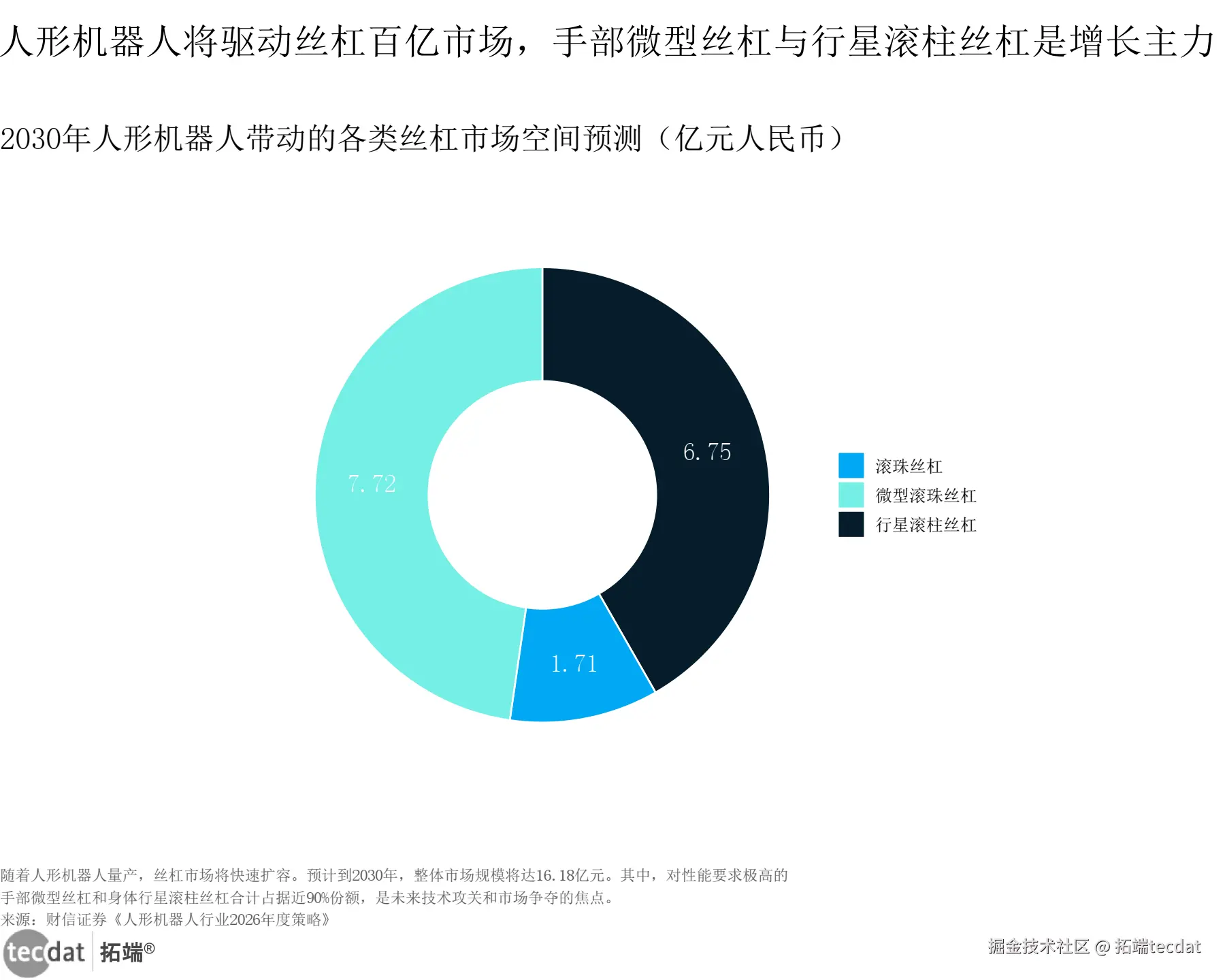 到2030年,仅人形机器人带动的丝杠市场规模将达16.18亿元,其中手部微型丝杠和身体行星滚柱丝杠合计占比近90%。
