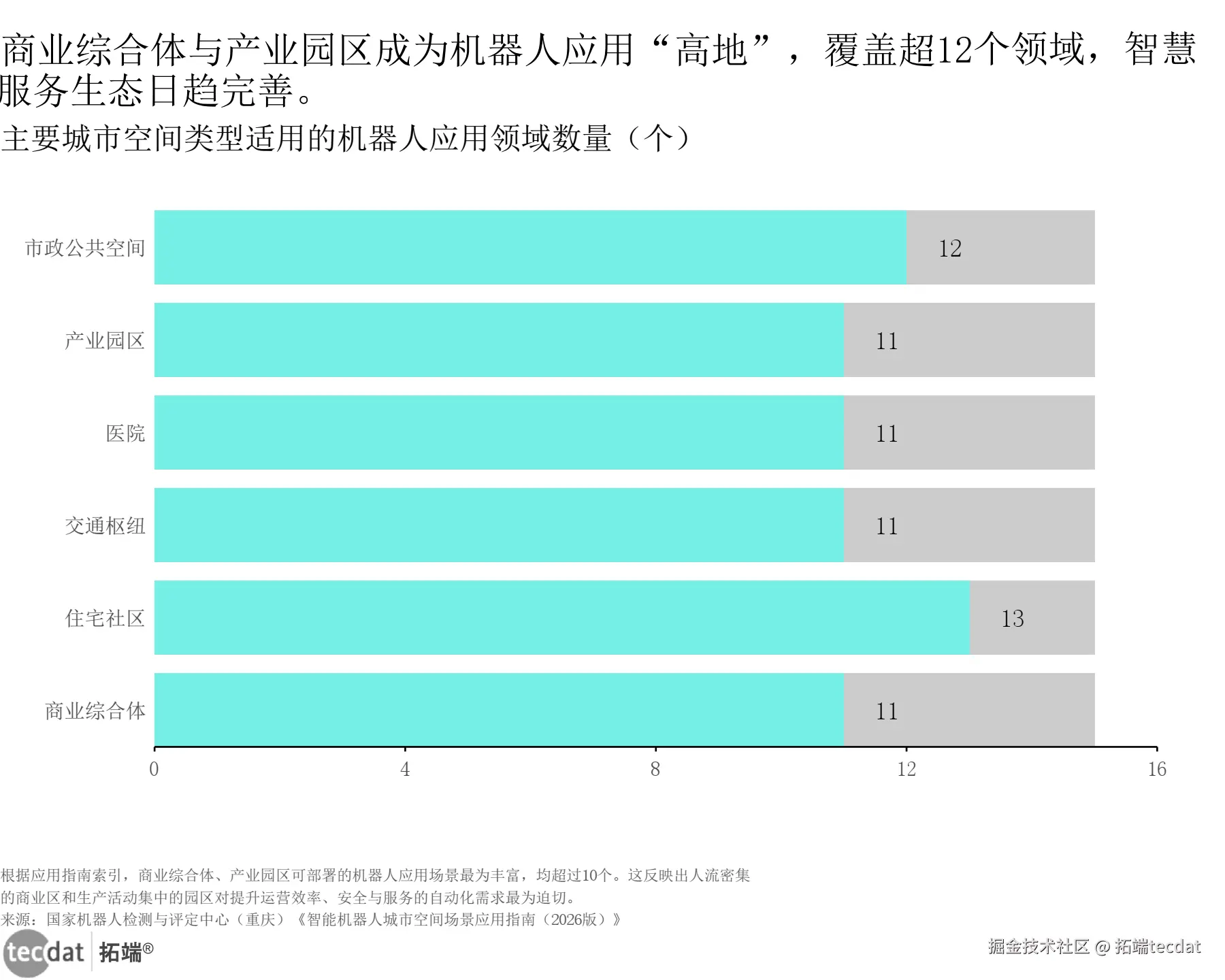 国家机器人检测与评定中心(重庆)发布的《智能机器人城市空间场景应用指南(2026版)》首次系统梳理了城市空间中的机器人应用场景。商业综合体、产业园区可部署的应用领域均超过10个,成为机器人落地的“试验场”与“价值高地”。