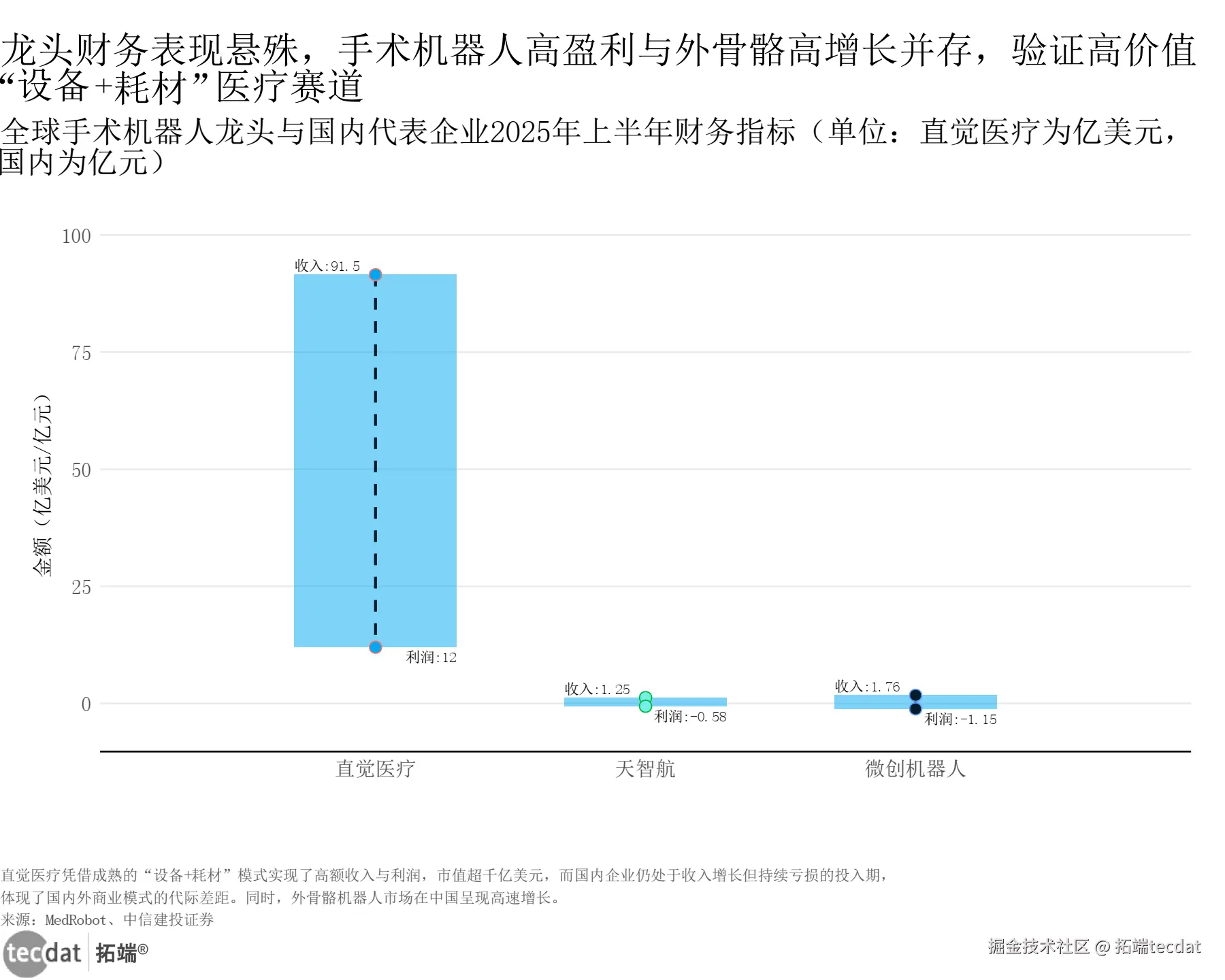 手术机器人领域,直觉医疗凭借“设备+耗材”模式实现高额盈利,2025年上半年收入91.5亿美元,净利润12亿美元,市值超1700亿美元。而国内企业天智航、微创机器人仍处于收入增长但持续亏损的投入期,体现了国内外商业模式的代际差距。