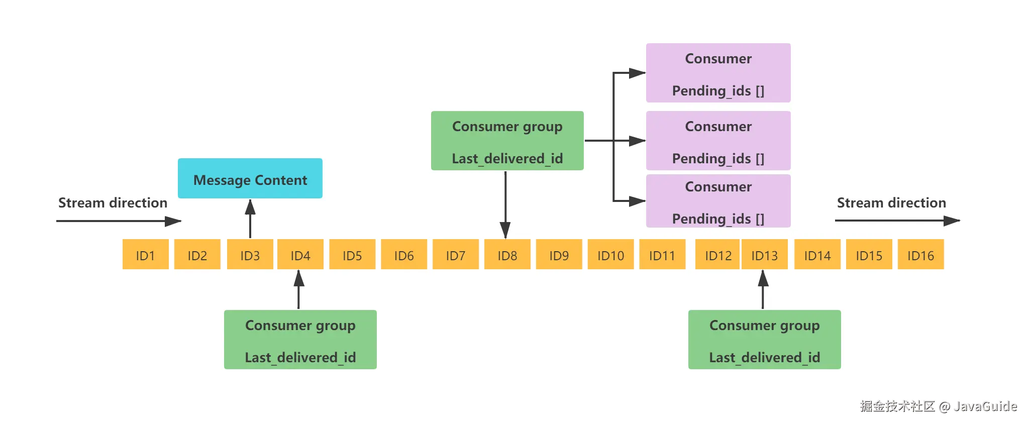 Consumer Group:消费者组用于组织和管理多个消费者。消费者组本身不处理消息,而是再将消息分发给消费者,由消费者进行真正的消费。last_delivered_id:标识消费者组当前消费位置的游标,消费者组中任意一个消费者读取了消息都会使 last_delivered_id 往前移动。pending_ids:记录已经被客户端消费但没有 ack 的消息的 ID。