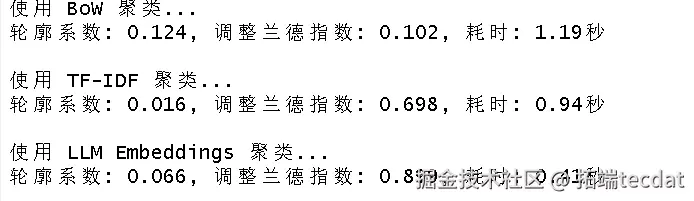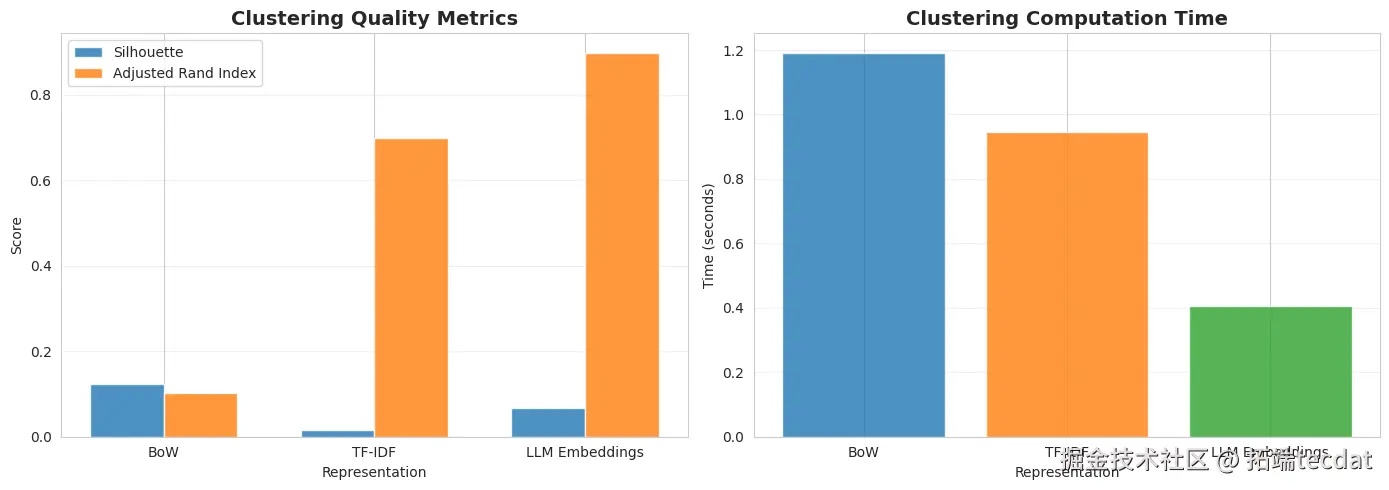 在聚类任务中,LLM嵌入以0.899的调整兰德指数(ARI)遥遥领先,表明其生成的簇与真实类别高度吻合。这是因为聚类完全依赖特征本身的内在结构,而嵌入包含了语义相似性,能更好地将同一主题的文章聚集在一起。尽管TF-IDF在分类中表现优异,但在无监督场景下,其基于词频的向量难以形成语义紧致的簇(轮廓系数仅0.016)。因此,若任务目标是探索性分析或主题发现,LLM嵌入是更优选择。