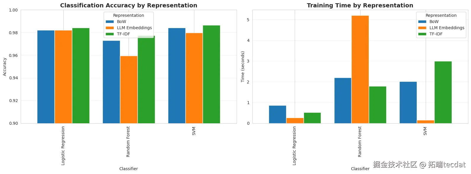 从结果看,TF-IDF + SVM 组合以0.987的准确率拔得头筹,而LLM嵌入 + 逻辑回归 训练最快(0.27秒) 。令人意外的是,最先进的LLM嵌入并未在所有指标上领先。原因在于BBC新闻数据集本身类别区分度极高(如体育类文章大量出现“足球”“比赛”等词),传统词频特征已足够捕捉规律;而嵌入模型带来的语义抽象反而可能引入噪声,且训练耗时更长。
