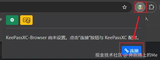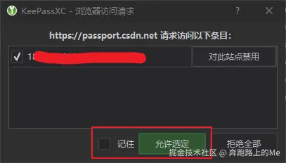d) 第四步:完成,浏览器插件可以访问KeepPassXC软件里面的密码实现填充,首次访问网站时一般会提示新增账号密码,如果密码正确就点新增,不正确就点取消