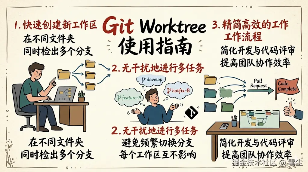 git worktree 就是在同一个 Git 仓库中,通过共用同一套历史记录,让你能同时在多个不同的工作目录下并行开发、测试或修复多个分支,而无需来回切换或重新克隆。