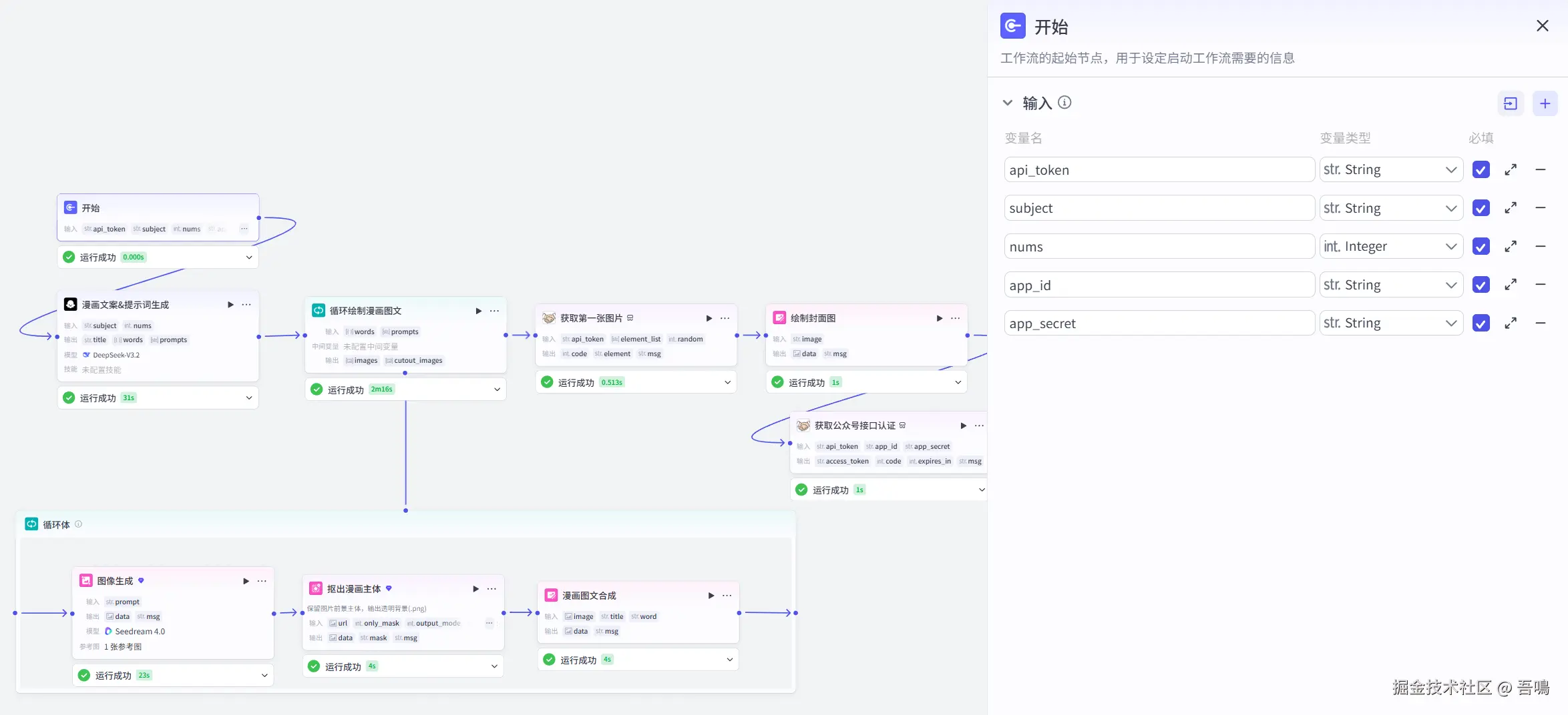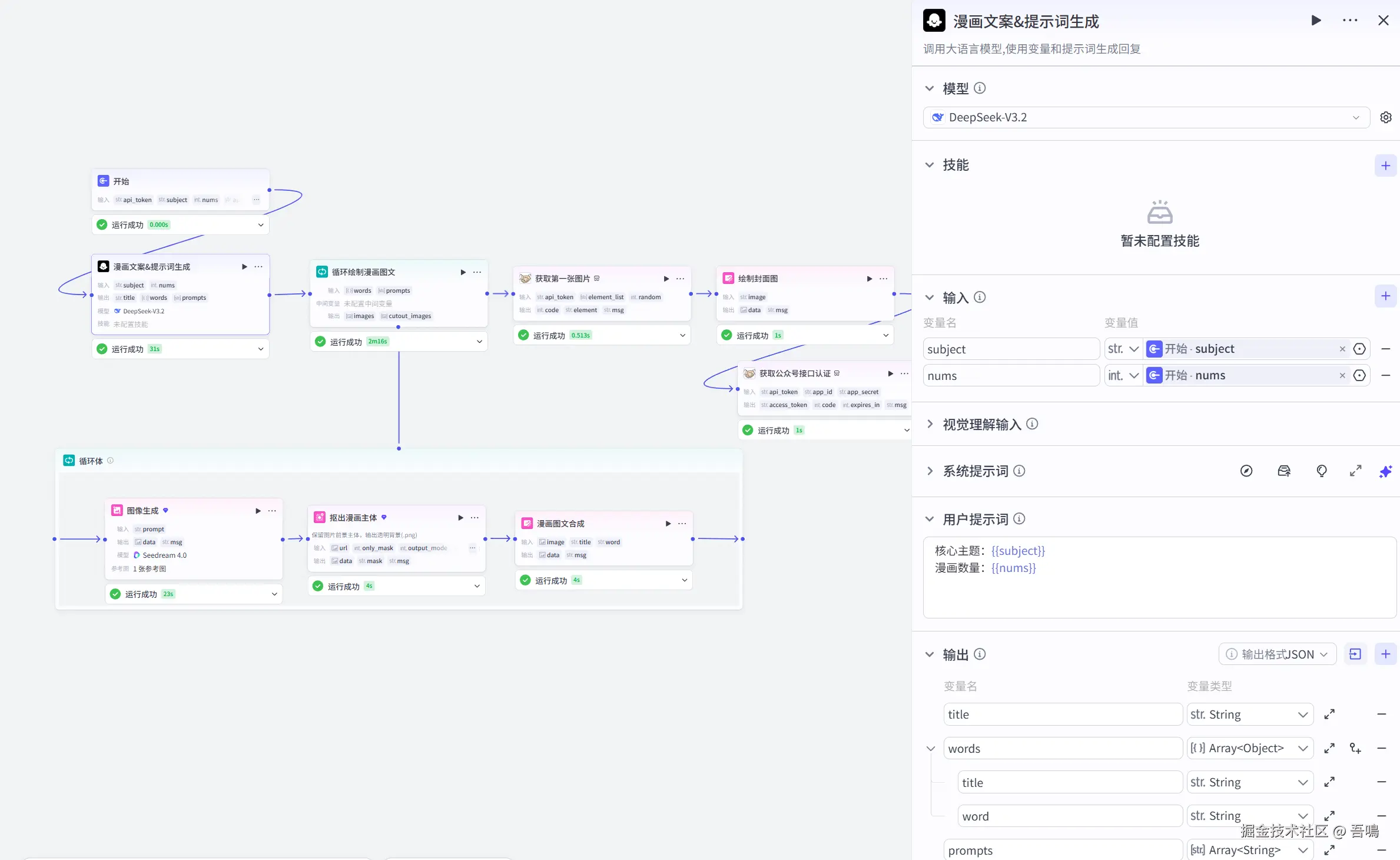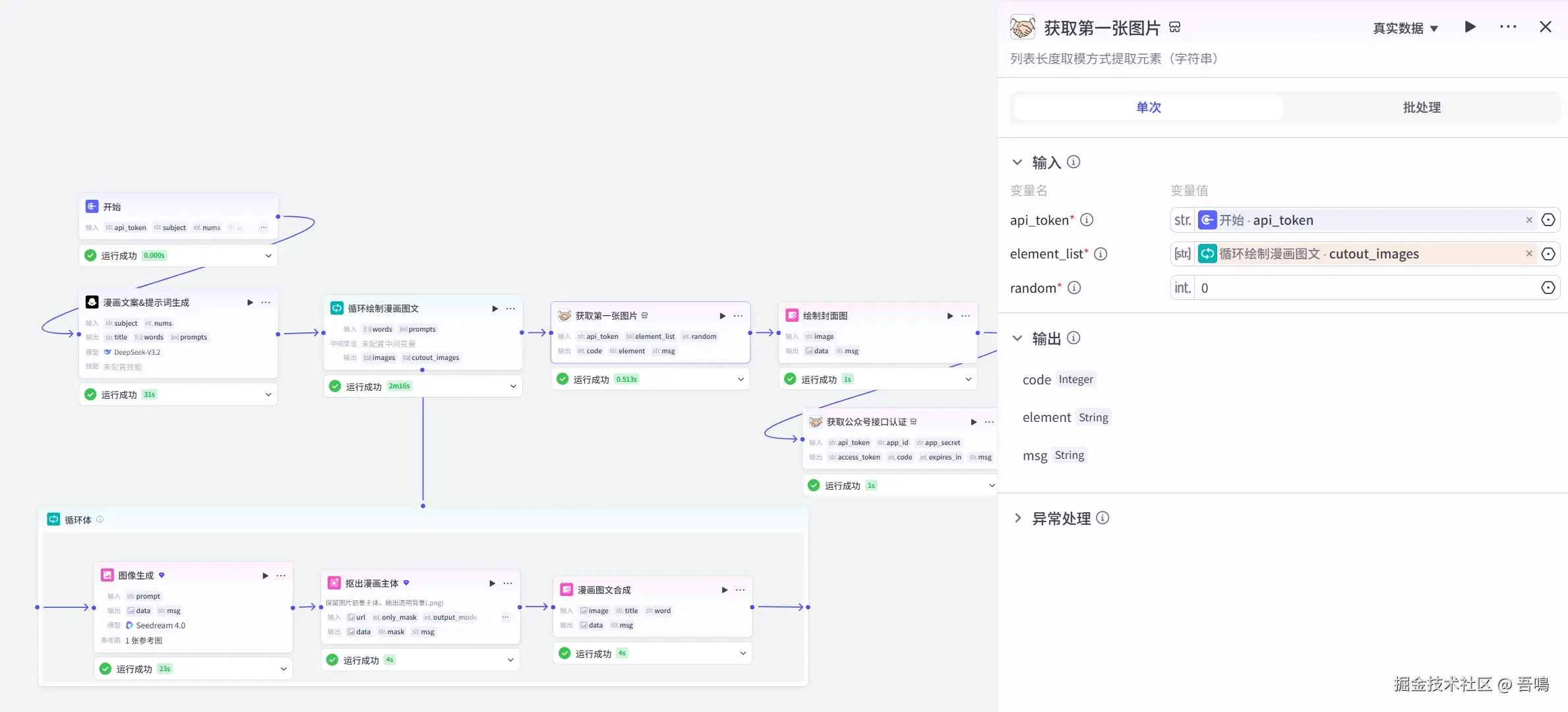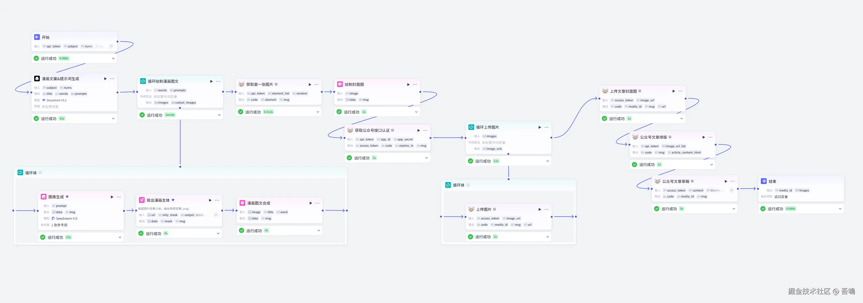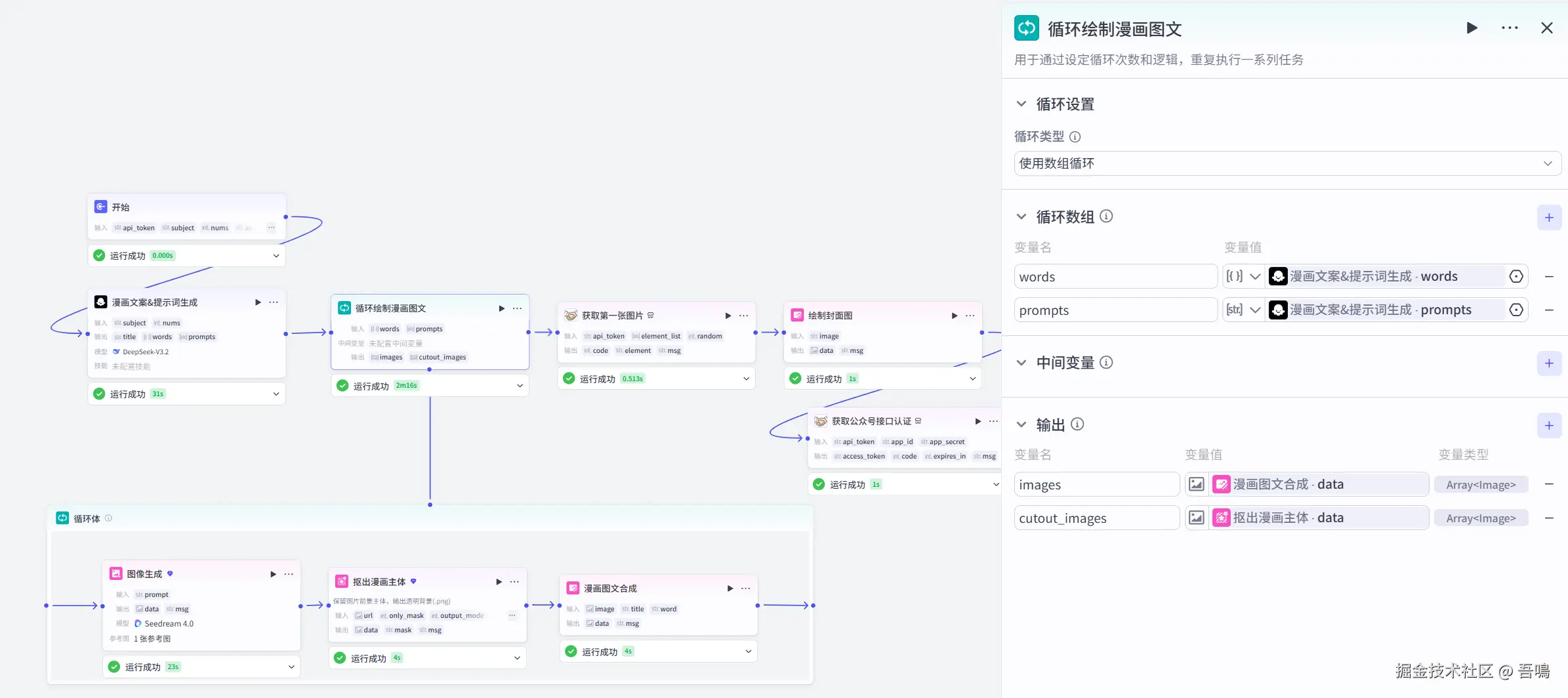 这个节点用来批量绘制漫画图文,使用到了扣子官方的循环节点。