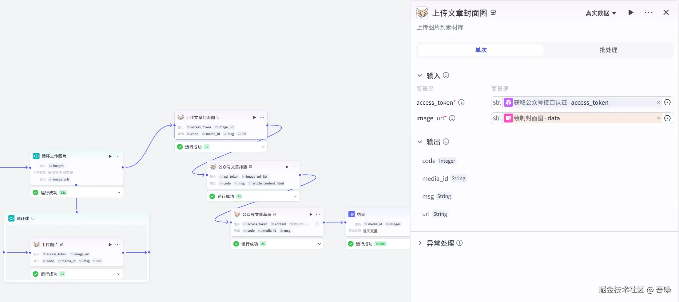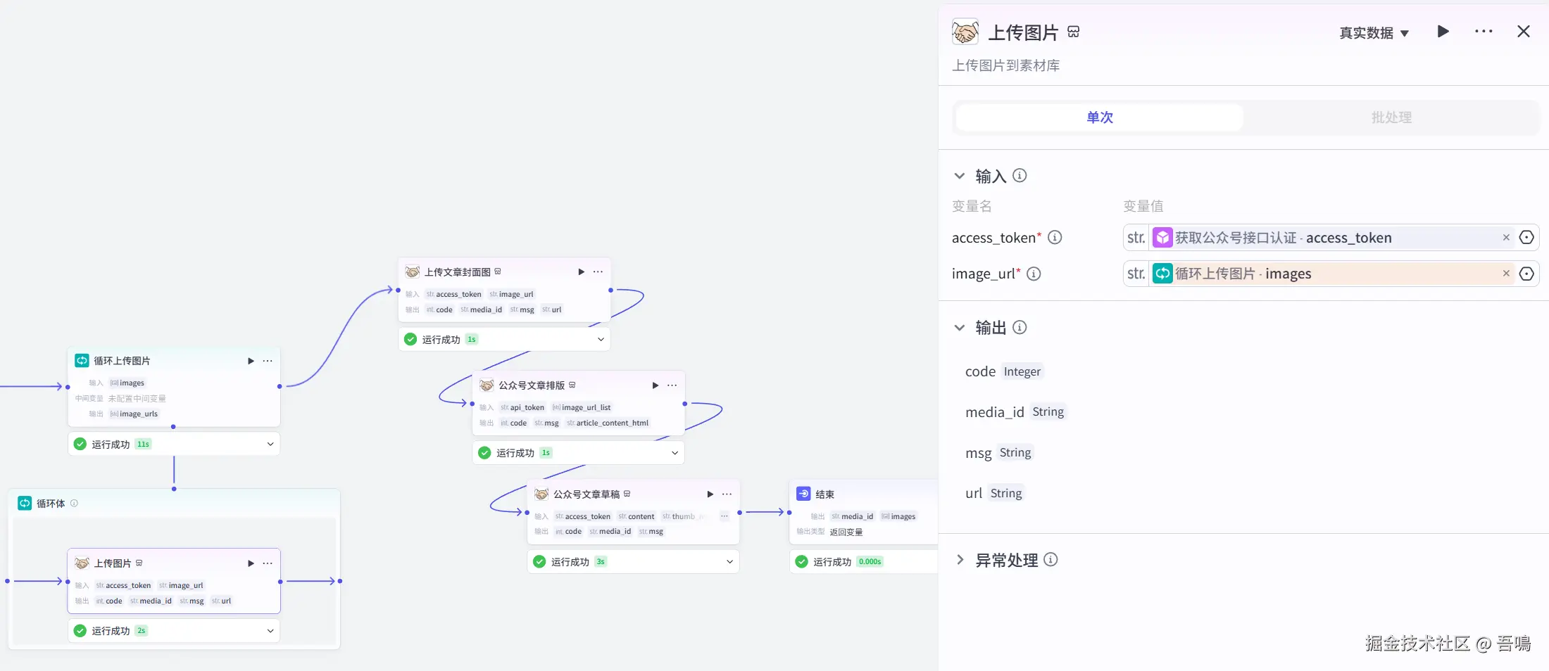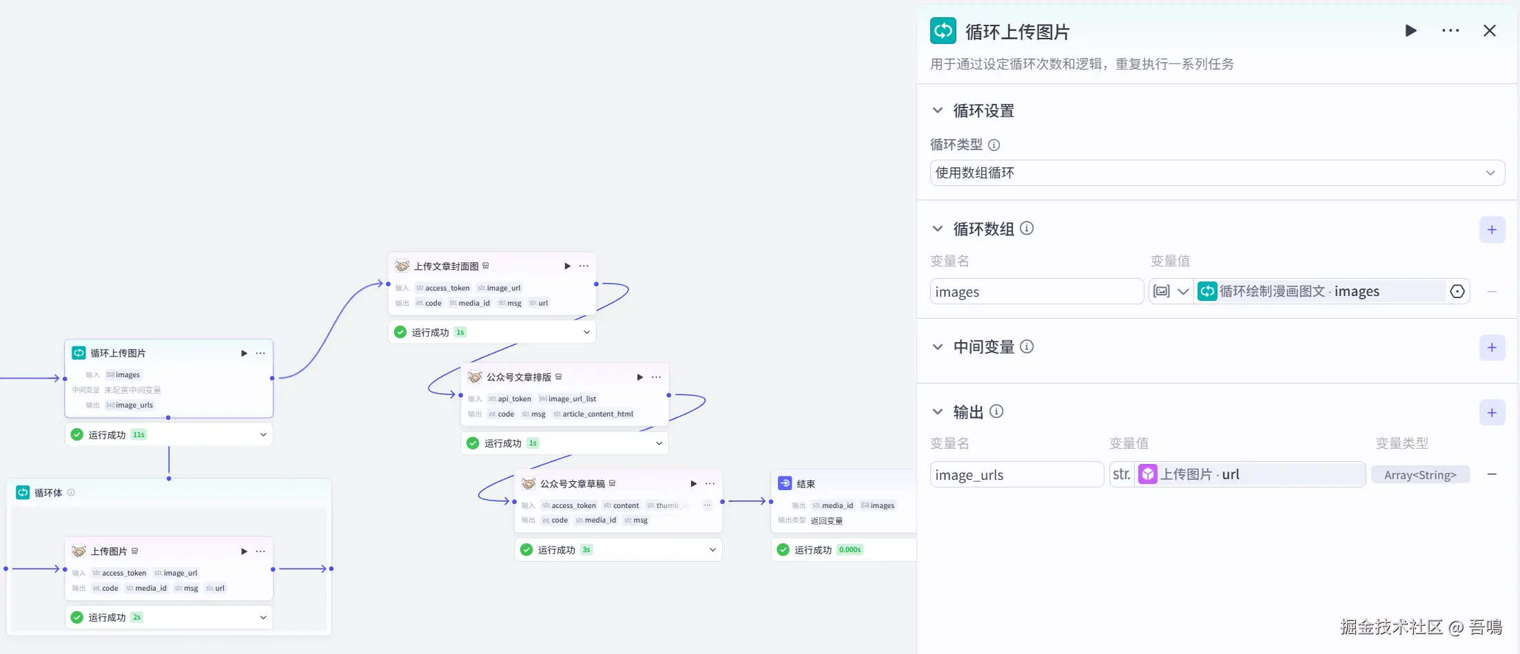 这个节点用来批量上传漫画图片到微信公众号的素材库中,使用到了扣子官方的循环节点。
