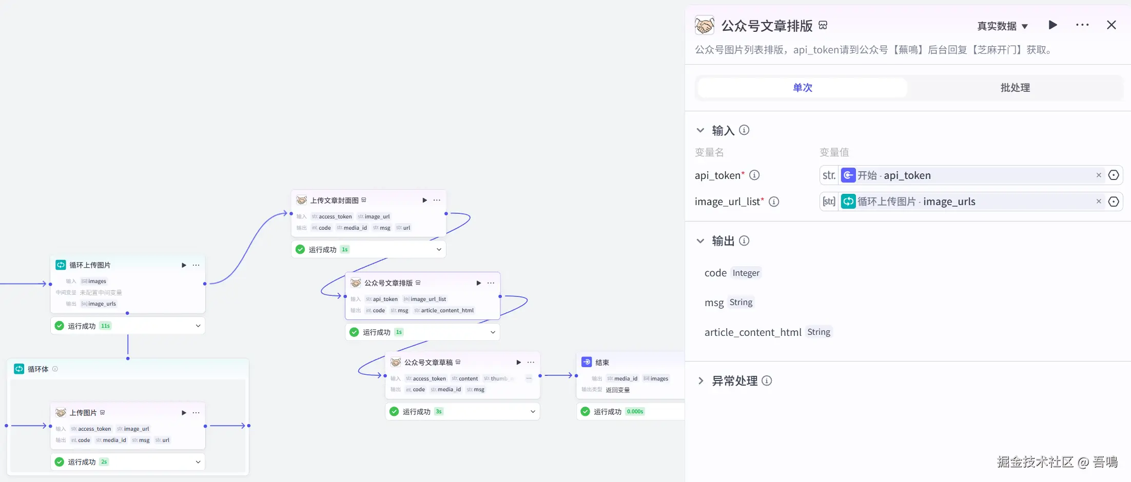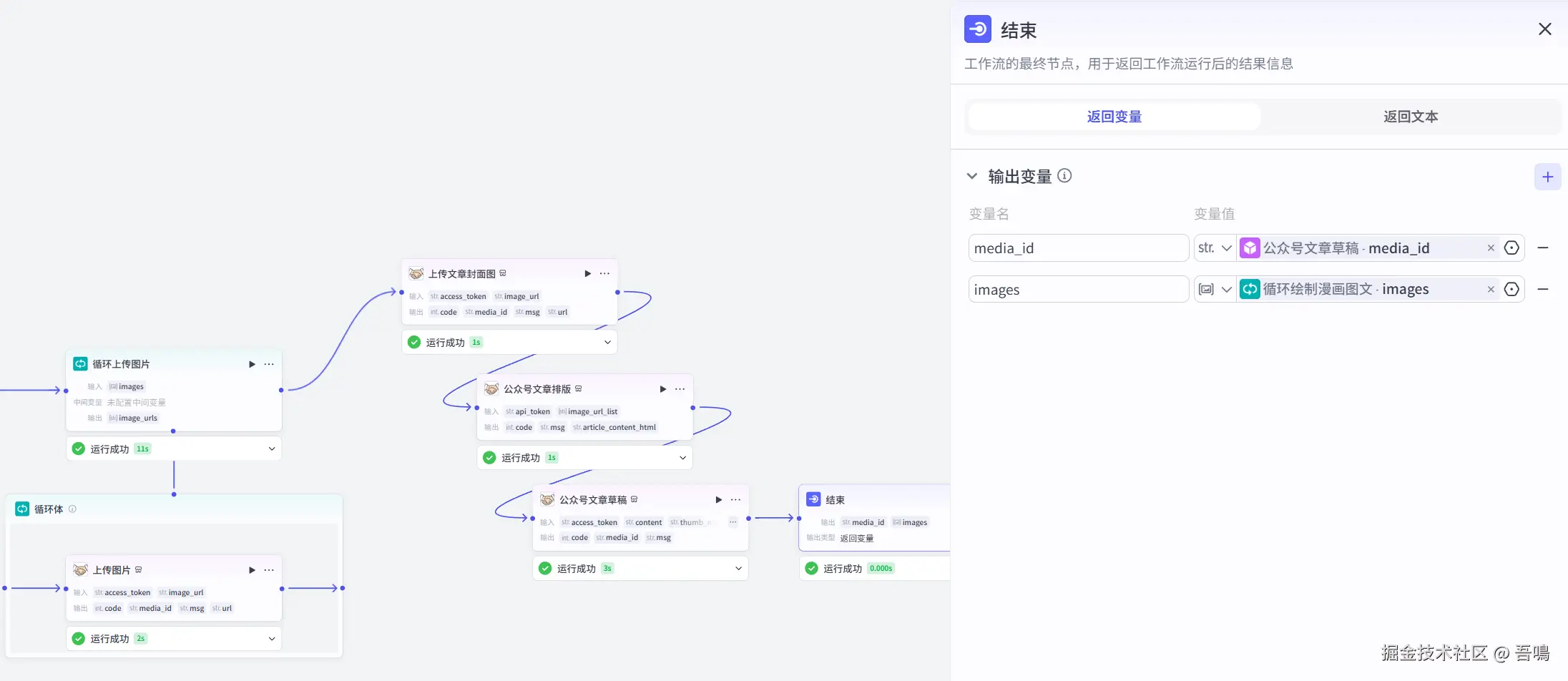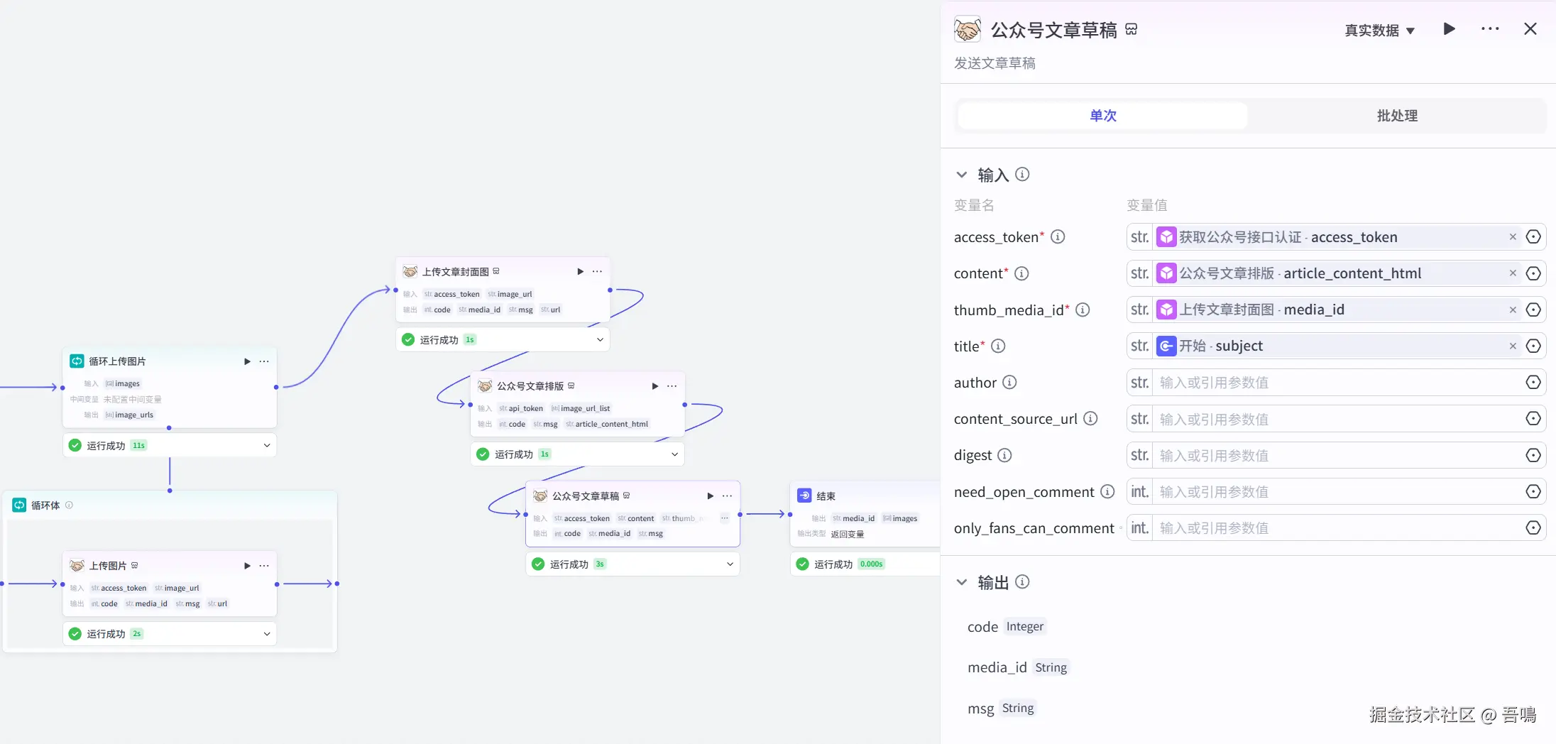 这个节点用来批量上传漫画图片到微信公众号的素材库中,使用到了扣子官方的循环节点。