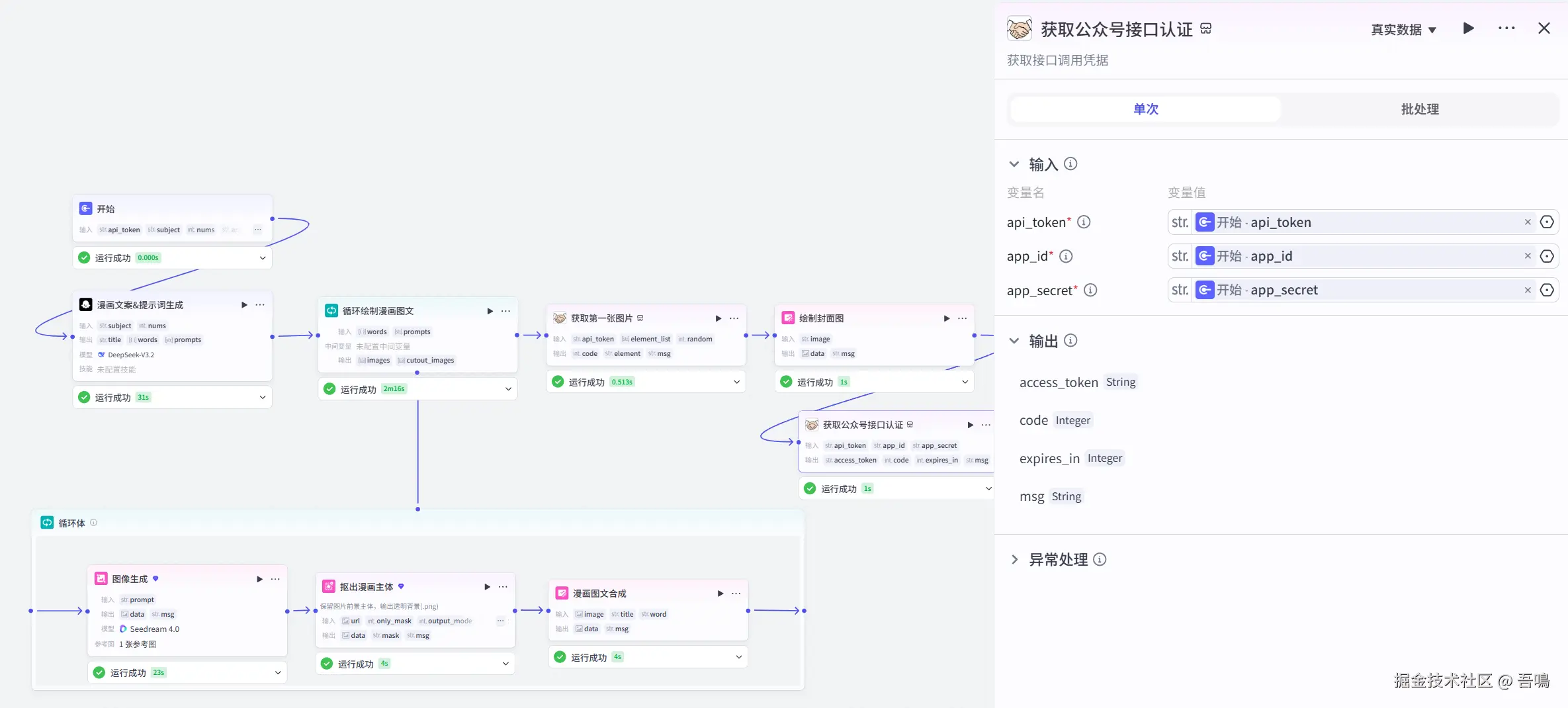 这个节点用来获取公众号的接口认证,后面用来上传漫画图文和生成草稿,使用到了扣子三方的插件【微信公众号接口】的【get_access_token】工具。