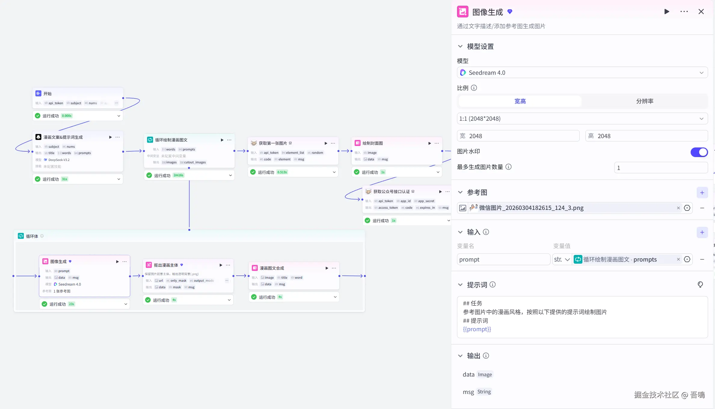 这个节点使用到了扣子官方的图像生成节点,用来根据提示词生成漫画图片,使用到了扣子官方的Seedream4.0。