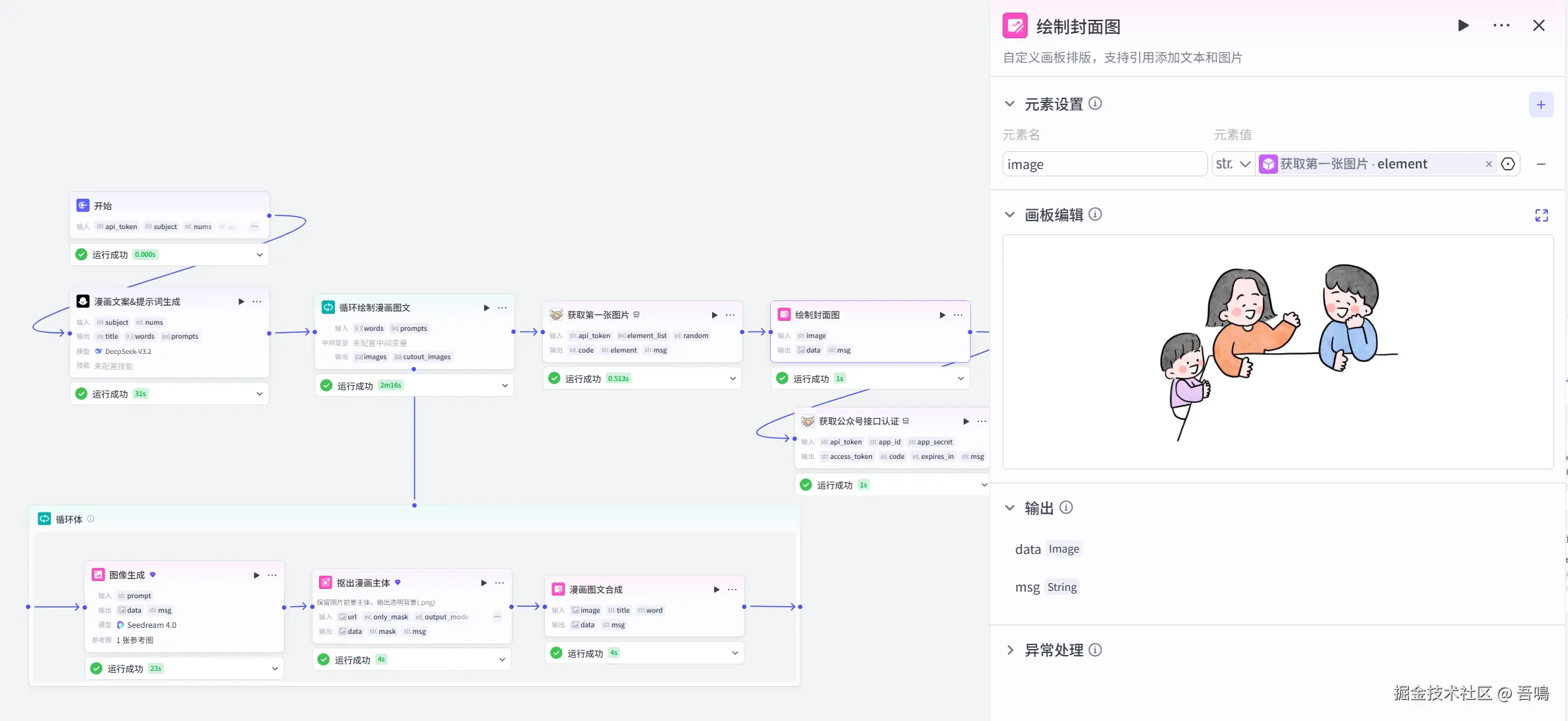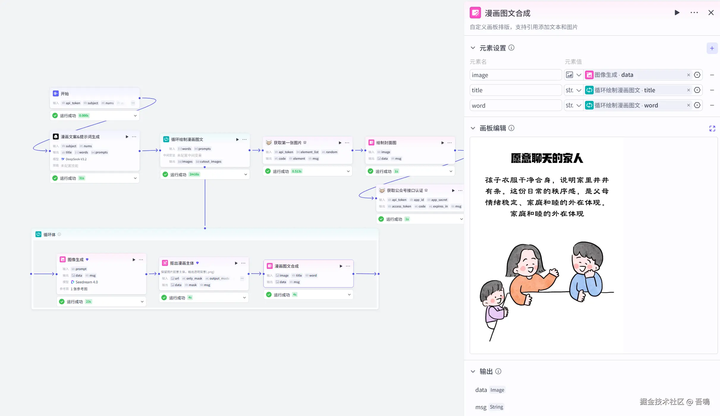 这个节点的作用的把生成好的漫画和文案合成一张漫画图片,使用到了扣子官方的画板节点。