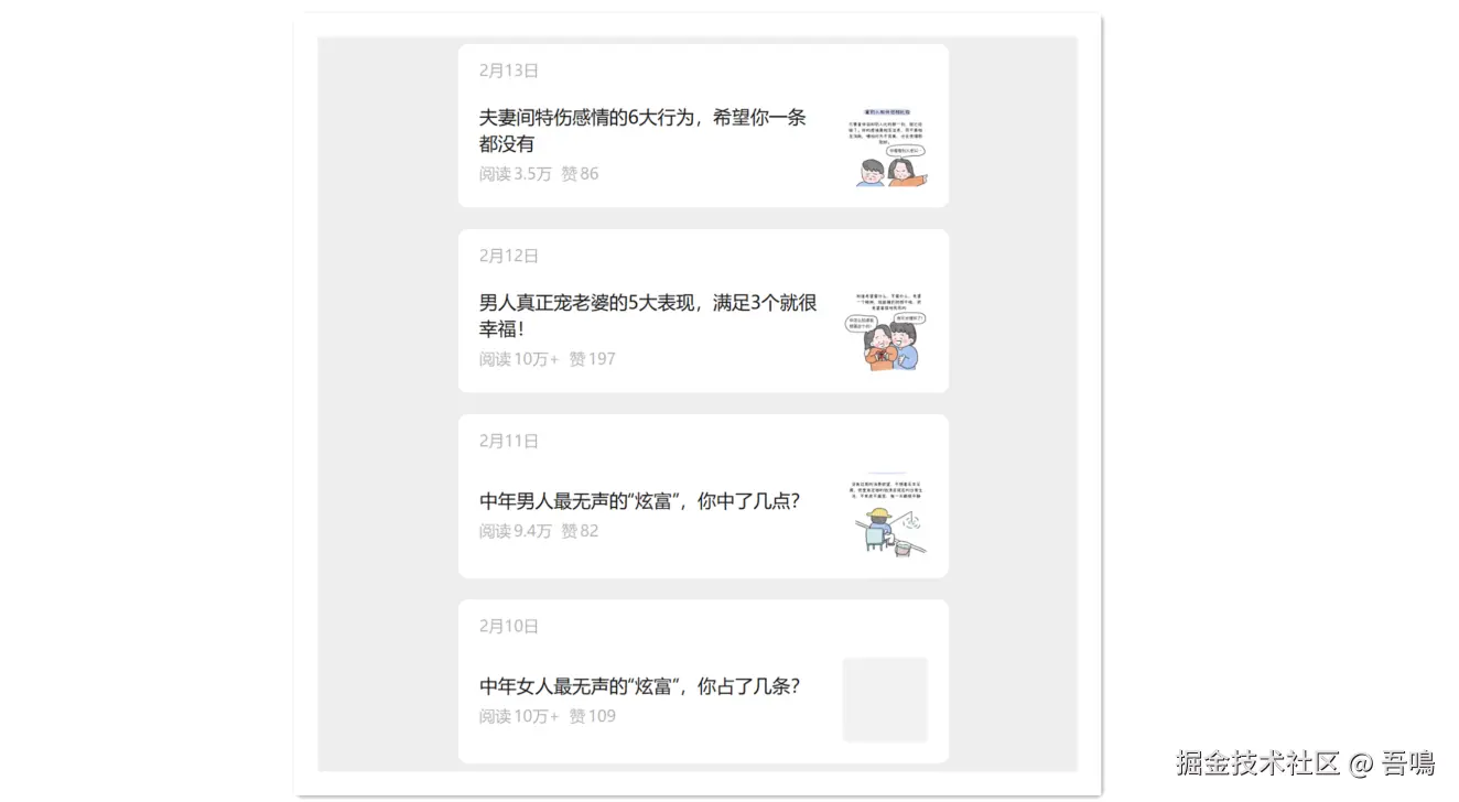 前段时间有些朋友给发送了一个公众号,公众号做的内容是关于宝妈的情感、育儿和成长赛道的图文漫画,看了看这个公众号的数据,很不错,经常能出10W+。
