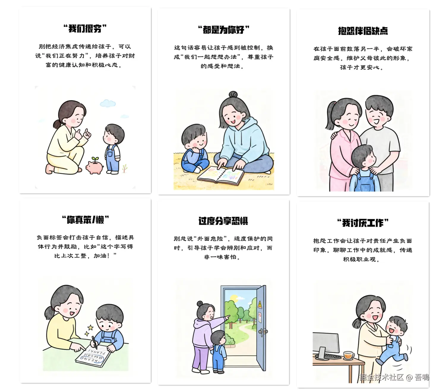 在开始Coze工作流的讲解之前,我们先来看看工作流产出的效果,比如我输入“拜托,请尽量不要和孩子分享这些”这么个主题,要求它生产漫画数量为6张,经过一杯茶的功夫,一篇公众号漫画图文草稿就生成了。
