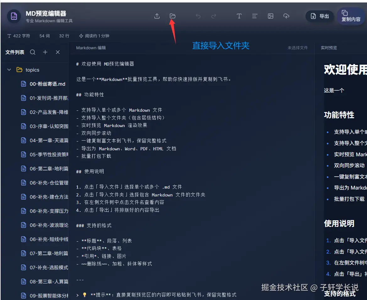 给没试过的朋友说说具体用起来有多方便:比如我电脑里攒了一堆整理好的MD格式文档,想要一次性全部预览排版,只需要直接点上传区就行,支持单个文件导入,哪怕你要导一整个文件夹进来也完全没问题。