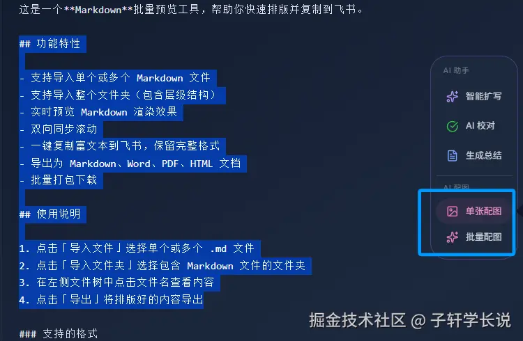 全部导入之后,你在左侧选中哪一篇,右侧直接就能实时预览效果,改一个标点符号都能立马看到变化,不用跳页刷新,用着特别流畅。