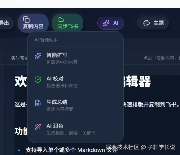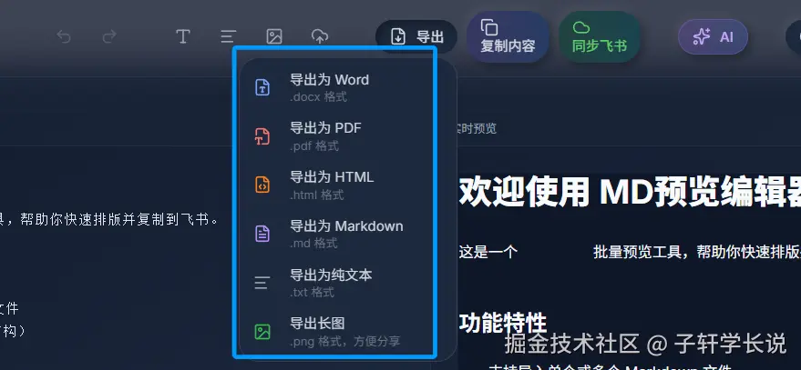不仅如此,排版好的内容还能自由导出各种格式,好多朋友需要把Markdown转Word存档或者交稿,之前用别的工具转完,格式乱得要重新调半小时,我这个直接点右上角导出,选Word格式就能直接导出,转完排版一点都不乱,打开就能用,效果真的没得说。