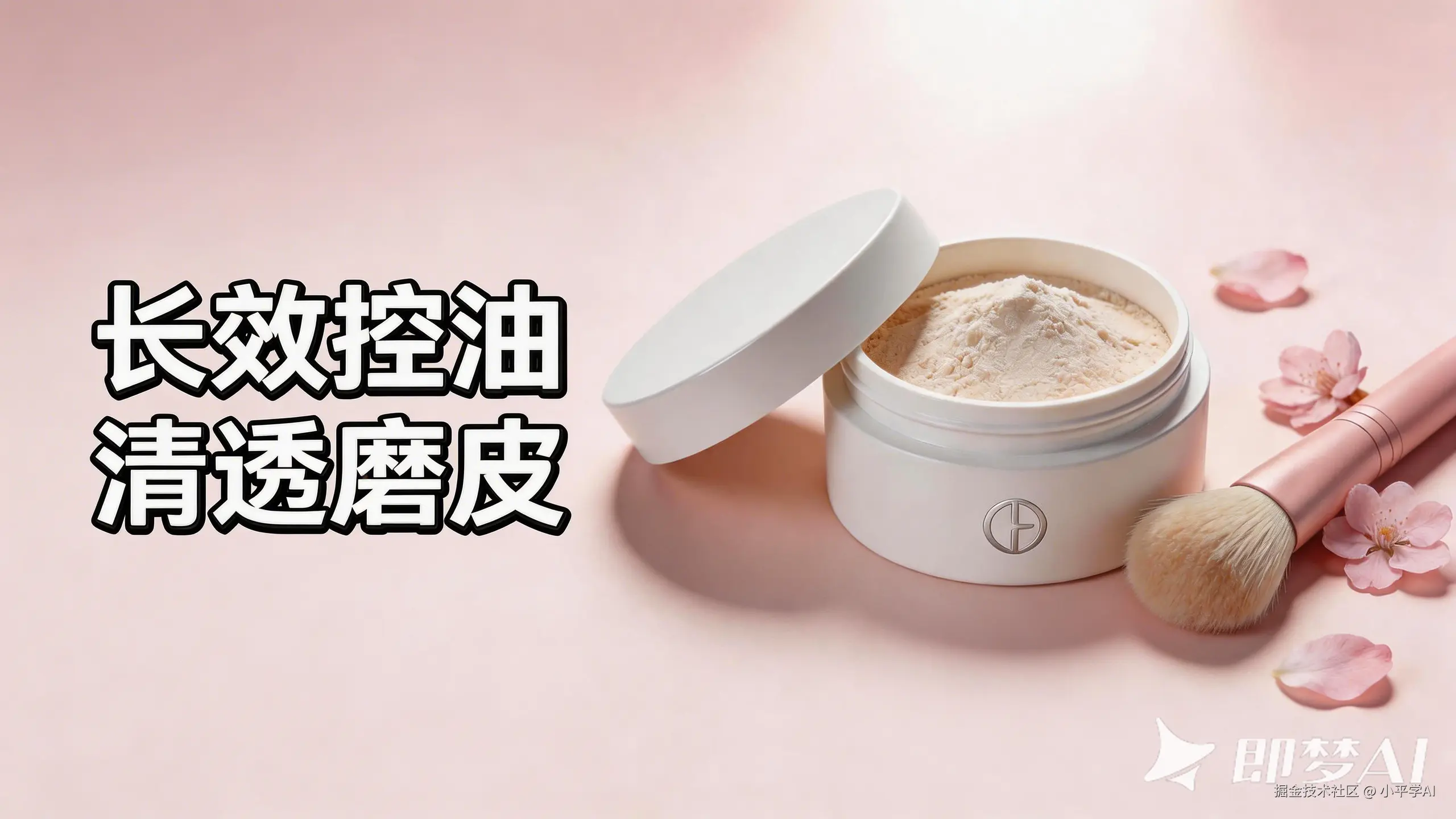 输入提示词:基于刚生成的散粉主图,制作16:9比例电商详情页头图,