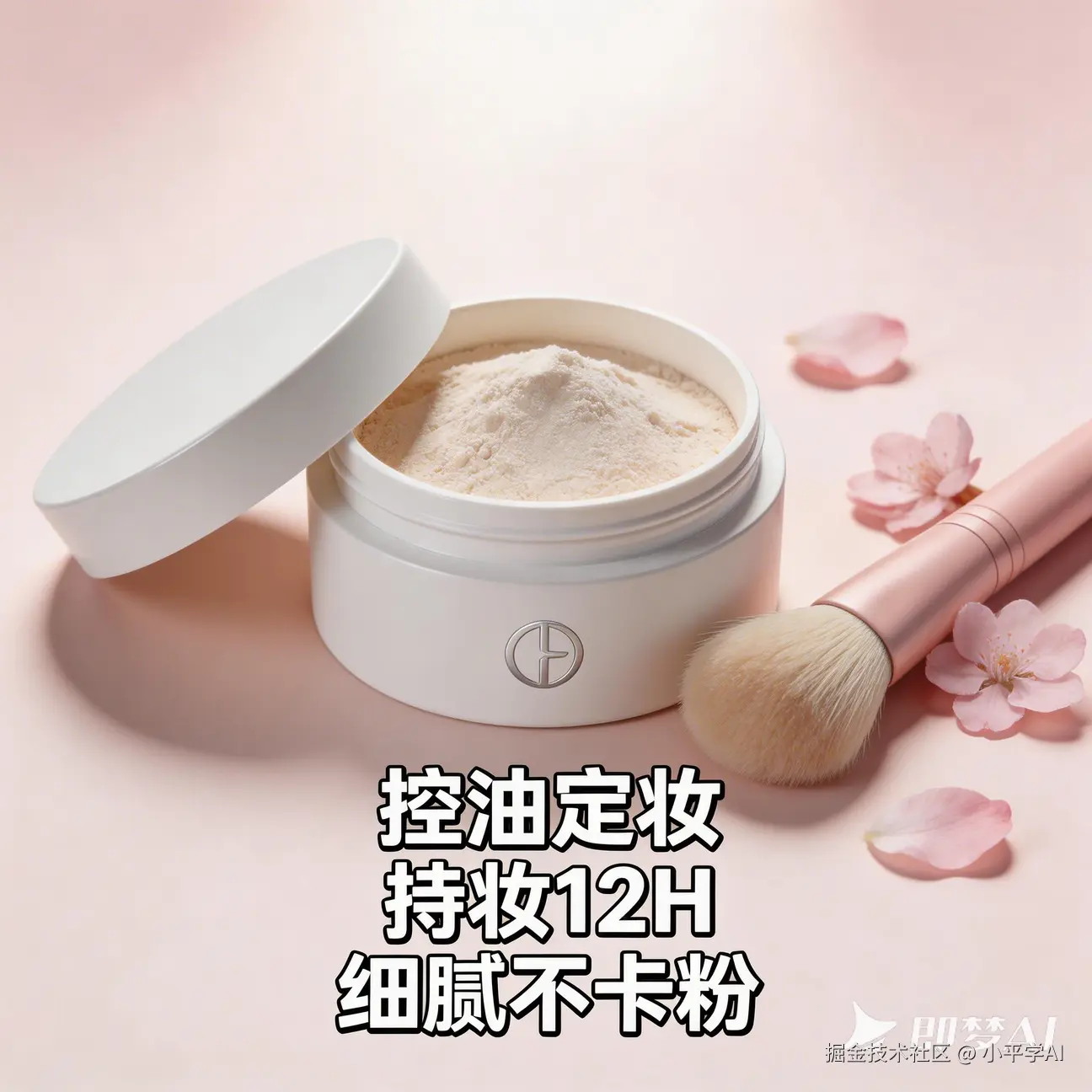正向提示词:电商正方形主图,超写实高清美妆摄影,画面主体是哑光白瓶定妆散