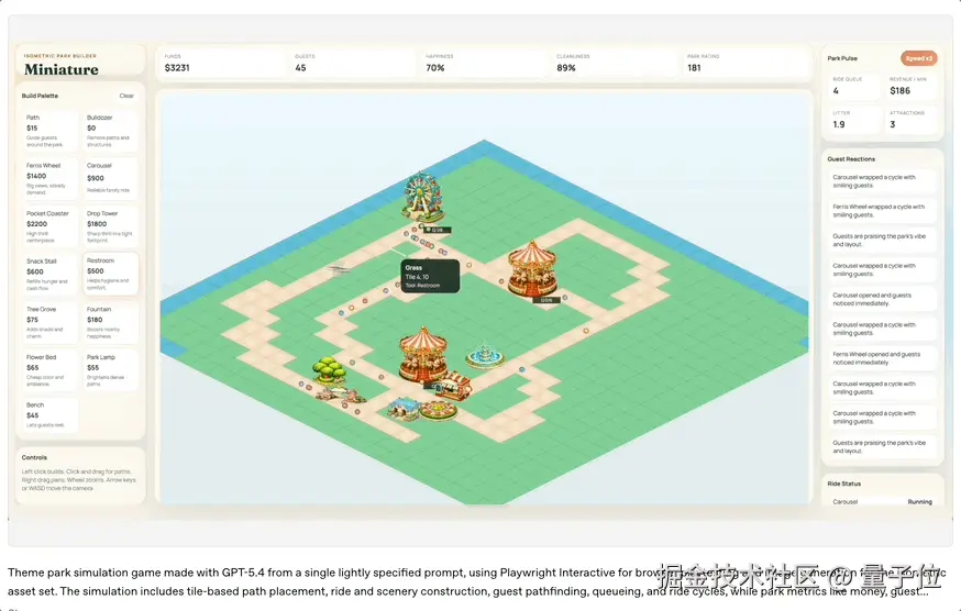 为了展示这一能力,OpenAI 演示了一个由 GPT-5.4 生成的浏览器主题公园模拟游戏。