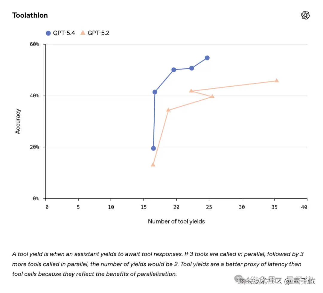 在 Toolathlon 基准测试中,GPT-5.4 取得 54.6% 的准确率,高于 GPT-5.2 的 45.7%。