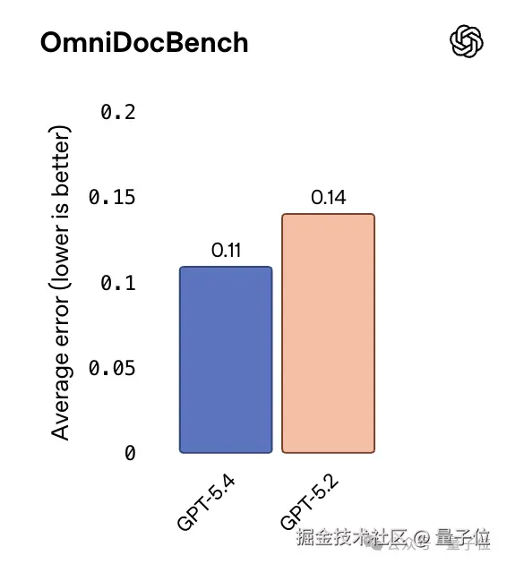 在 OmniDocBench 测试中,GPT-5.4 的平均错误率从 0.140 下降到 0.109。