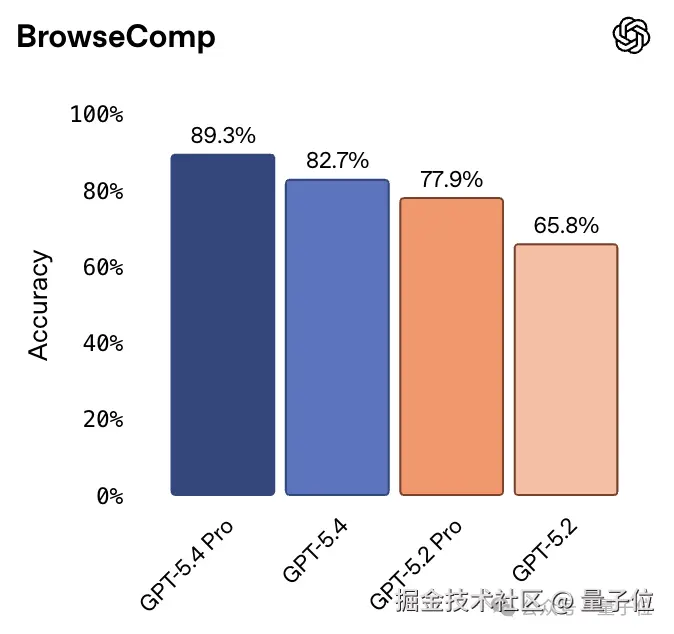 在 BrowseComp 测试中,GPT-5.4 的成绩达到 82.7%,而 GPT-5.4 Pro 达到 89.3%,比 GPT-5.2 提升 17 个百分点。