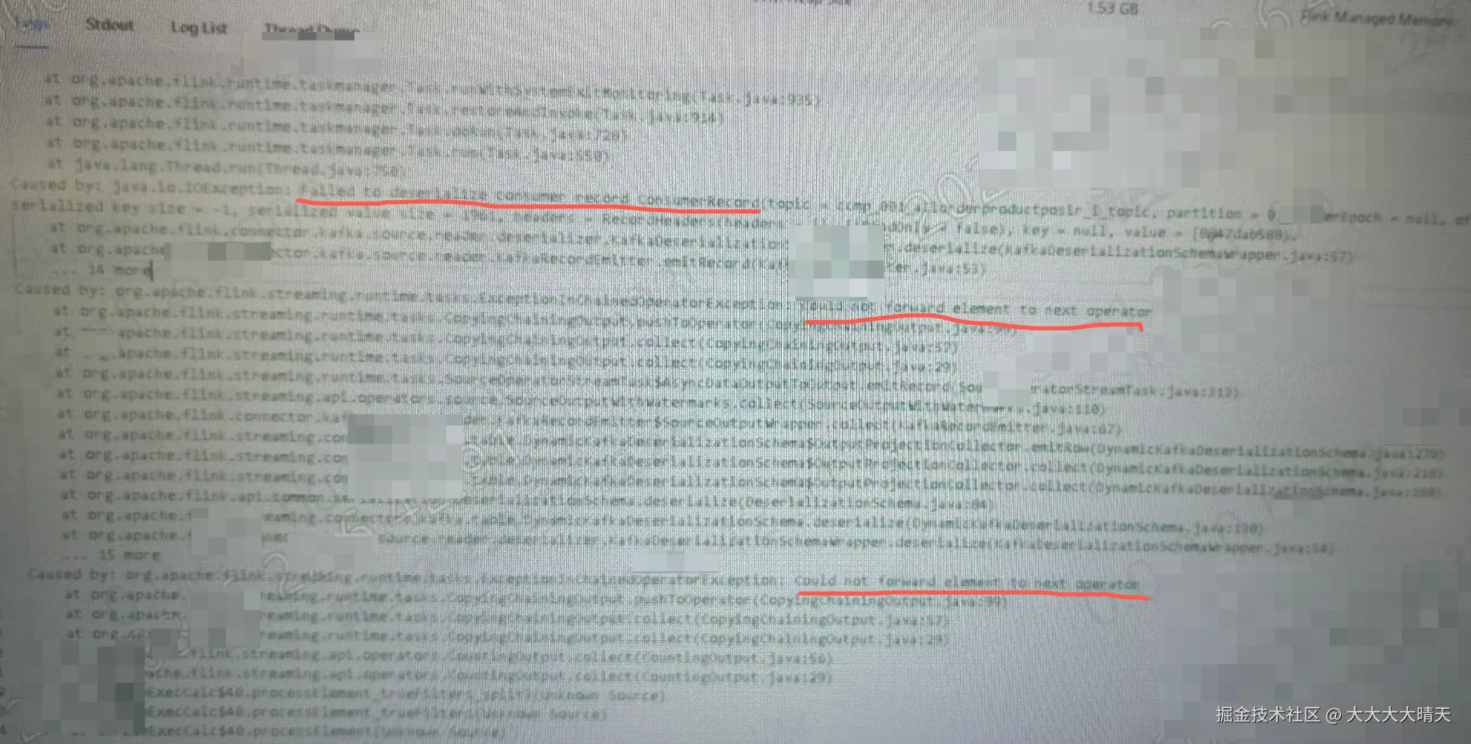 1.排查监控与日志Flink作业的运行监控指标除了numRestarts与checkpoint指标异常,其他均正常;查看TM运行日志,发现有大量的反序列化异常日志:Failed to deserialize consumer record due to ...,无法将element发送给下一个算子。