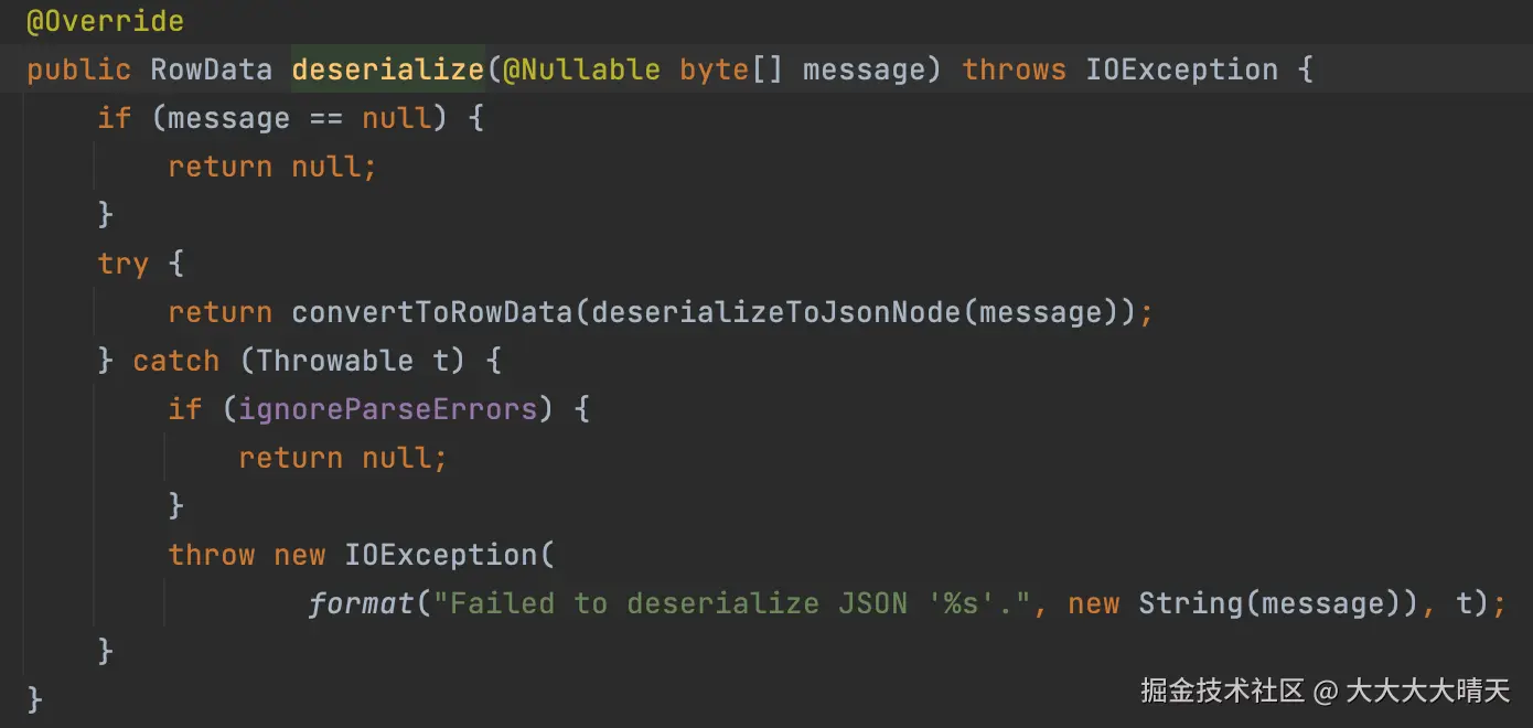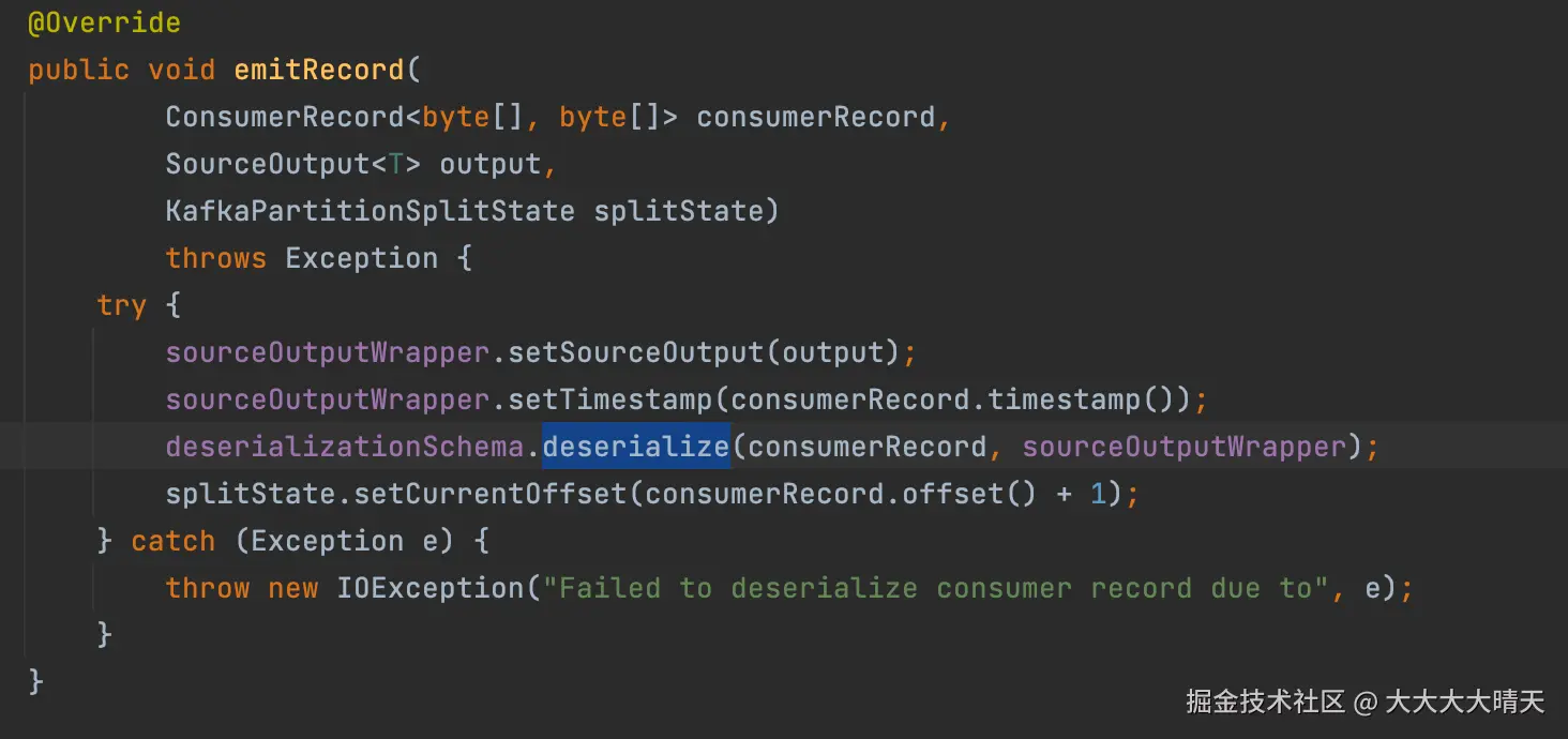 3.根据异常日志堆栈分析Flink源码我们深入 Flink 1.16 源码,梳理了 Kafka 消息反序列化的完整调用链:KafkaRecordEmitter.emitRecord:调用 deserializationSchema.deserialize,若失败则抛出 IOException("Failed to deserialize consumer record due to ", e)。