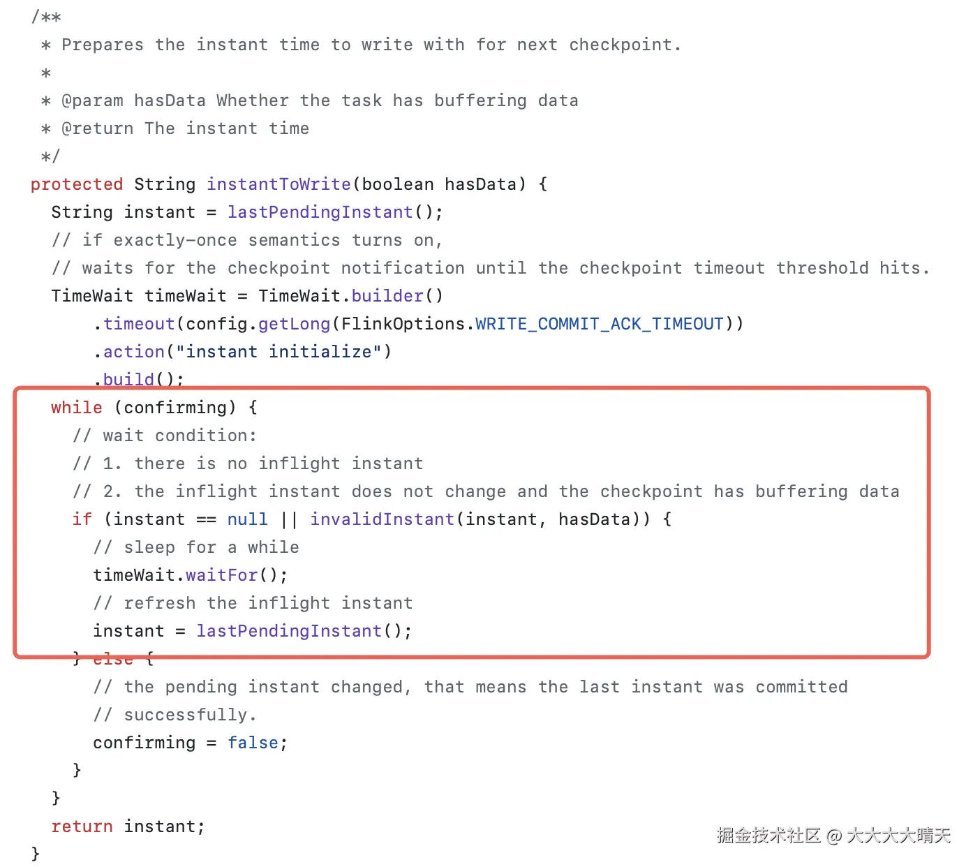 当 Flink 作业开启 Exactly-Once 语义时,Hudi Sink 的instantToWrite方法会等待 Checkpoint 确认(即等待 commit 成功)。当某个 checkpoint 对应的 Hudi commit 一直处于 pending 状态(未完成也未失败),此方法会陷入无限等待,导致后续 checkpoint 无法推进,最终整个 Flink 作业超时失败。