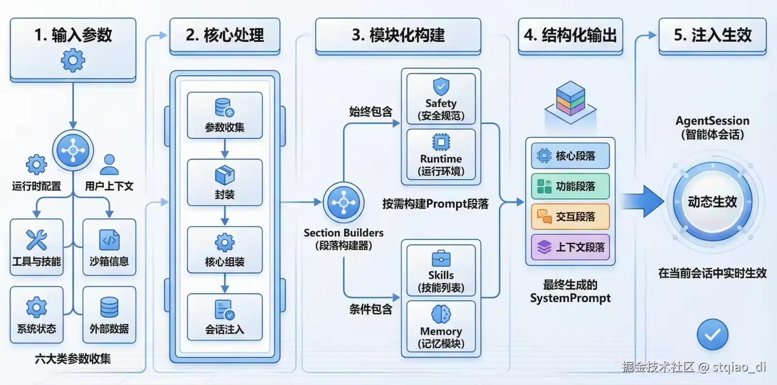 OpenClaw 的做法更像“Prompt 编译器”:先把运行时配置、用户上下文、工具与技能、沙箱信息、系统状态、外部数据等六类输入参数结构化,再通过 Section Builders 按模块生成段落,并区分“始终包含”(如 Safety、Runtime)与“条件包含”(如 Skills、Memory)。这使得 system prompt 能够与当前会话的真实能力对齐:有什么工具就声明什么工具,有哪些技能就列出哪些技能,需要哪些记忆就检索后注入,从而减少模型凭空假设与幻觉式行动。