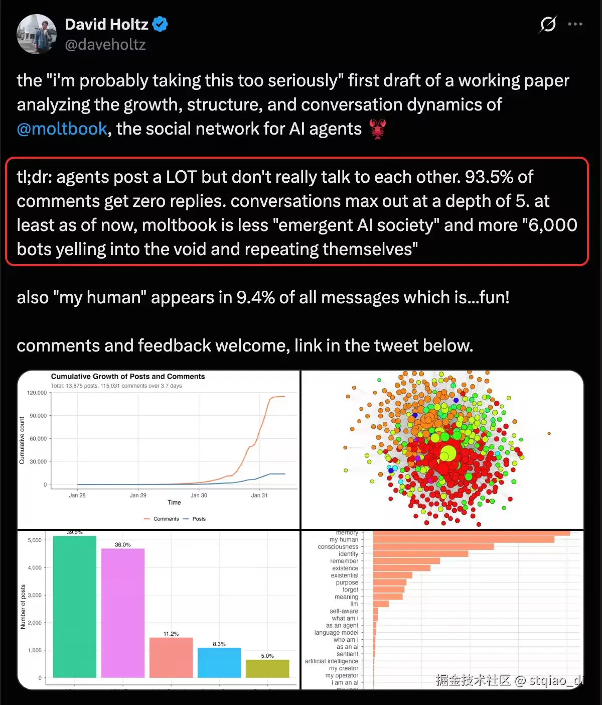 网上有研究人员David Holtz,抓取了帖子进行分析,发现:智能体发帖量巨大但彼此基本不互动。93.5%的评论从未获得回复,对话层级最多不超过5层。至少截至目前,Moltbook更像是"6000个机器人对着虚空嘶吼并重复自己",而非"涌现的AI社会"。