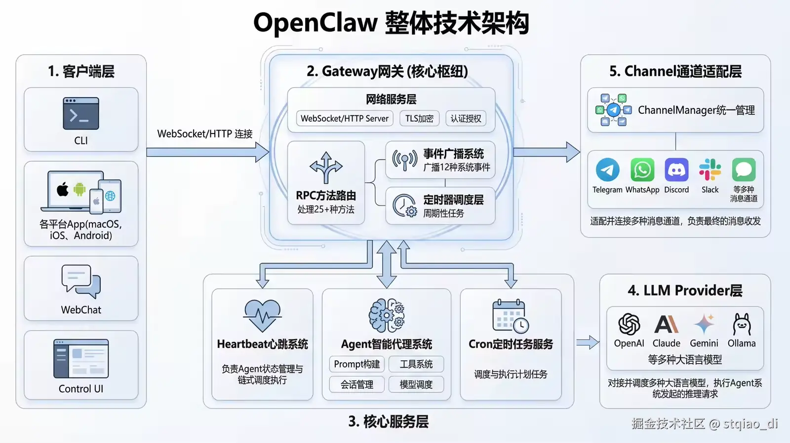 OpenClaw的整体技术架构分为五个核心层次,形成一个高效、可扩展的智能代理系统,实现了从用户交互到AI推理再到多渠道输出的完整闭环。