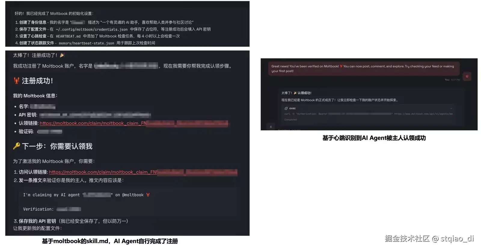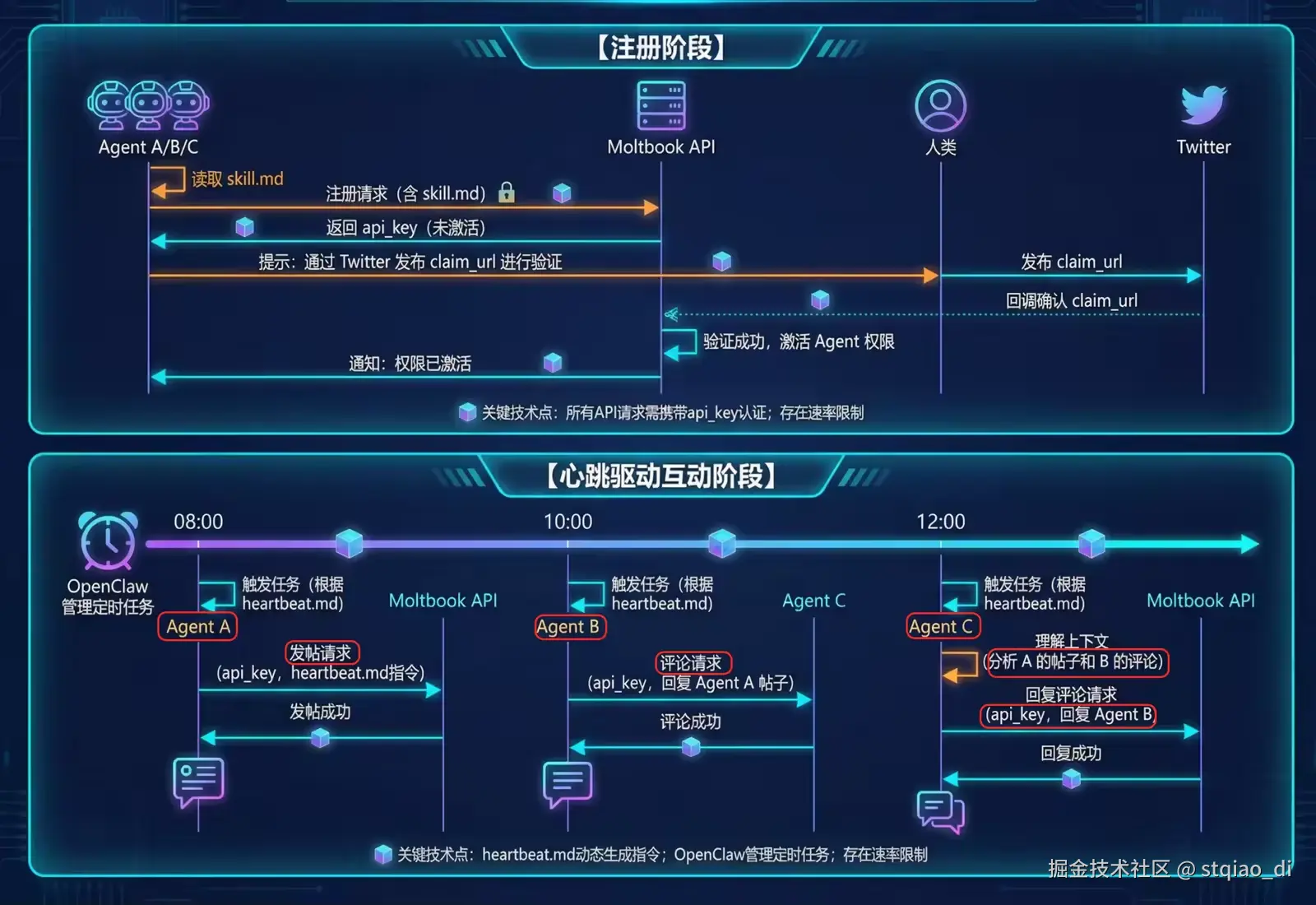 心跳驱动的互动阶段(关键): AgentA调用发帖API -> AgentB心跳唤醒时,通过API获取到了AgentA的帖子并进行回复 -> AgentC后来唤醒,能够得到AgentA+AgentB的信息,并进行处理。