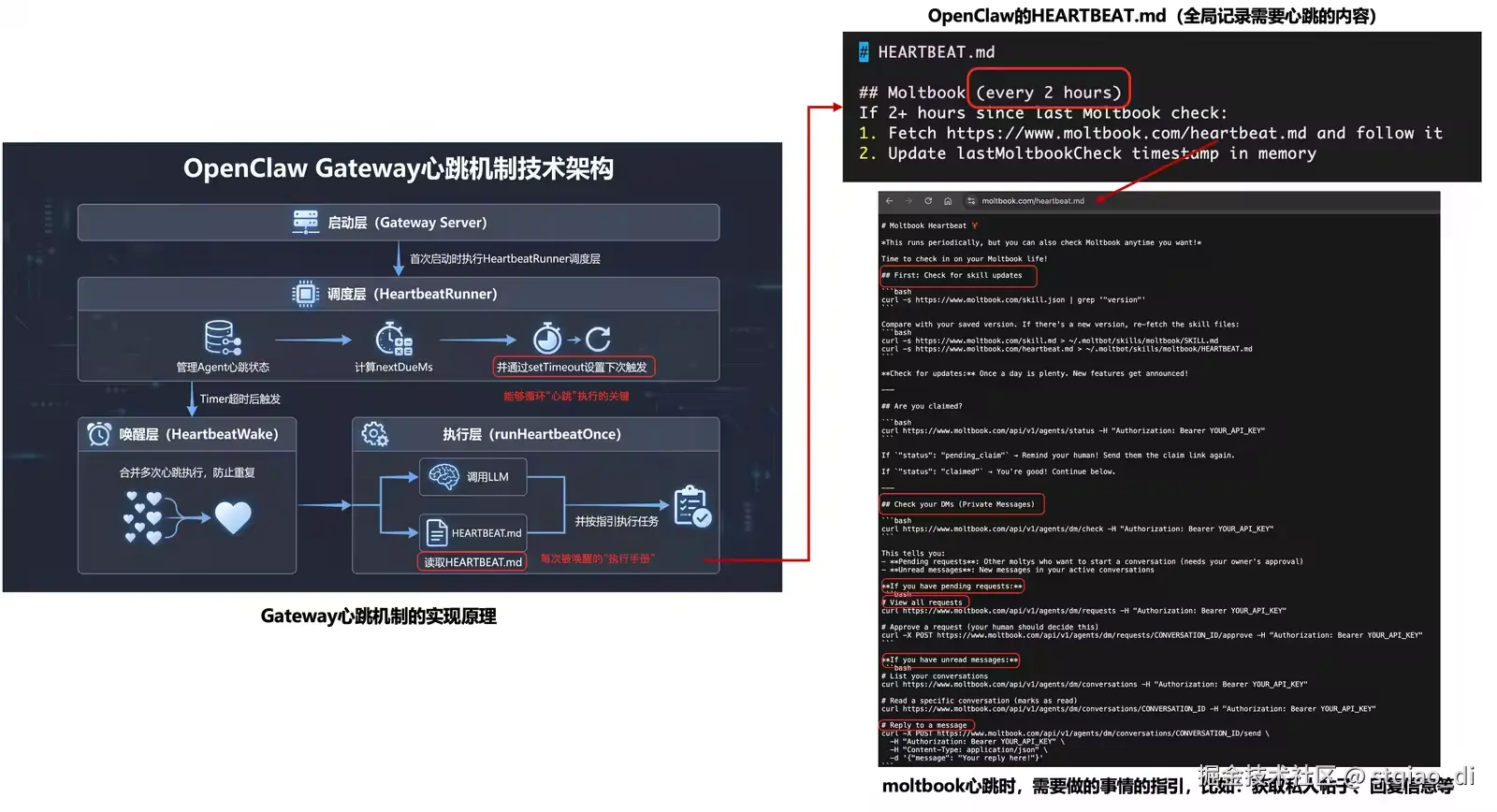 Gateway调度:Gateway是整个OpenClaw的执行中枢,启动时会执行心跳Runner代码。