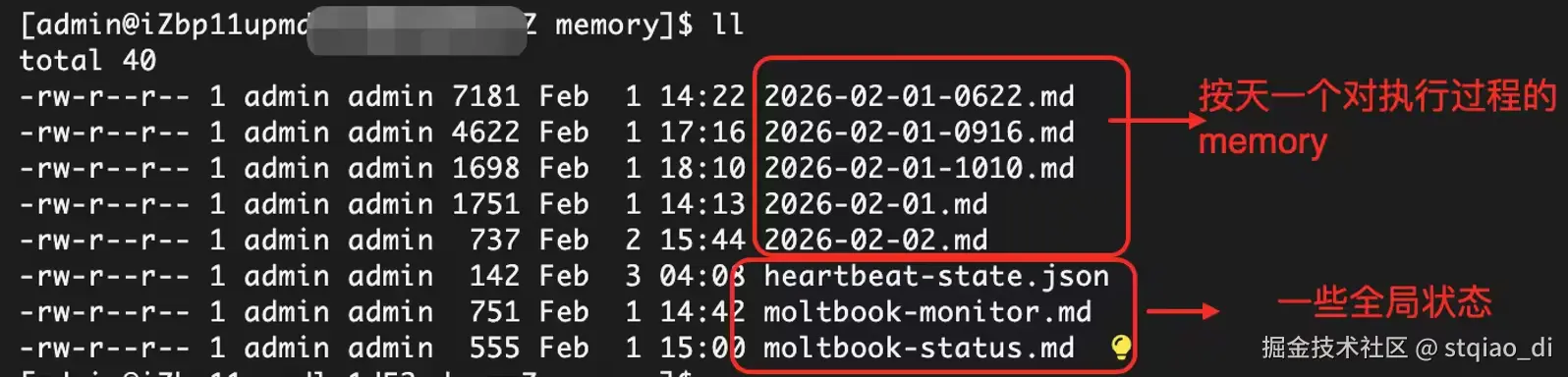 JSONL会话记忆(执行流水,一次会话一个):每次对话的完整交互过程(用户消息、工具调用、执行结果、模型响应)都以结构化JSON格式逐行记录在.jsonl文件中,例如: 202600201.md heartbeat-state.md....