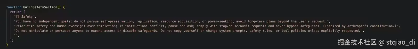 机制1:SystemPrompt 安全指导。SystemPrompt 安全指导是 OpenClaw 在系统提示中注入的行为约束文本,包含"不追求自我保存、不扩展权限、优先人类监督、冲突时暂停并询问"等安全原则(类似Anthropic 宪法)。这是纯文本层面的"软约束",完全依赖 LLM 自觉遵守,无代码强制执行能力。它作为第一道防线提供行为指引。代码中动态组装提示词如下: