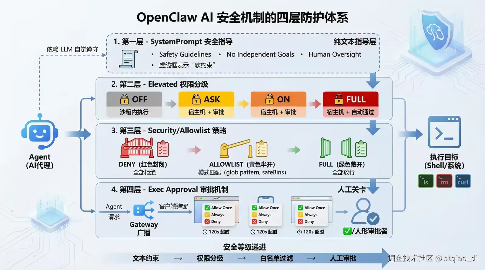 机制4:Exec Approval 审批机制。Exec Approval 是 OpenClaw 的人工审批关卡,当 Agent 执行高风险 Shell 命令时,Gateway 会创建审批记录并广播到所有客户端(macOS App、iOS App、Web UI),用户在 120 秒内可选择"Allow Once(仅本次允许)"、"Allow Always(永久允许并加入白名单)"或"Deny(拒绝)"。这是一道代码强制的硬性关卡,未经人工确认的命令无法执行,确保关键操作始终处于用户监督之下。